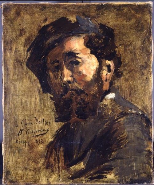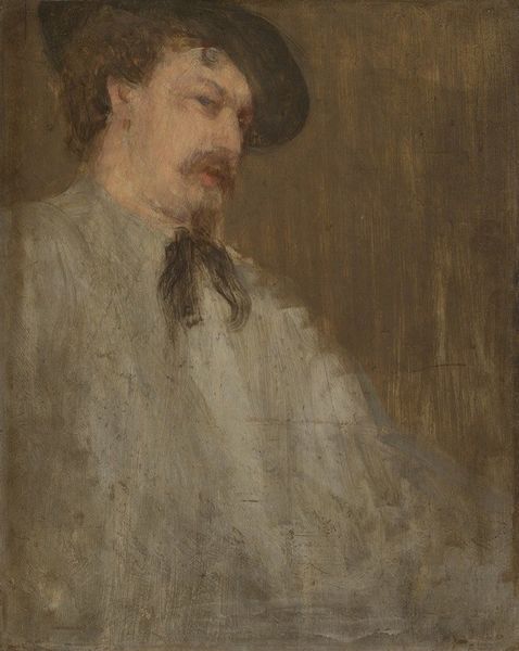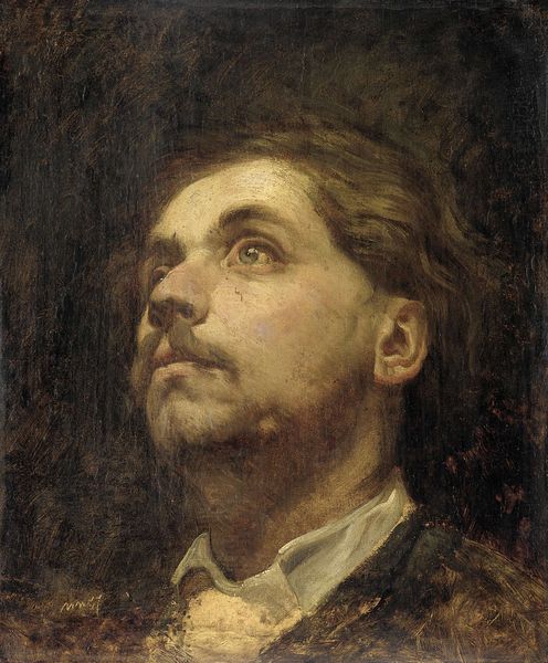 Editor: We are looking at Giovanni Boldini’s "Portrait of the Artist Ernest Ange Duez," painted in 1896. It’s an oil painting, fairly small. I’m struck by its informal, almost conversational feel. How do you interpret this work, given the time it was created? Curator: The painting is fascinating when considered within the context of late 19th-century artistic circles and burgeoning bourgeois culture. Consider how portraiture had historically served as a tool of power and status for the aristocracy. By the late 1800s, with Impressionism’s rise and a shift in social structures, portraiture was being redefined. It could be a mark of belonging and inclusion. How do you read the artist’s gaze here? Is it challenging? Or something else? Editor: He appears quite self-assured. Comfortable, even. Curator: Exactly. Boldini presents Duez not as some distant, idealized figure, but as an equal. The brushstrokes, the dark palette, and the intimate framing all contribute to a sense of shared artistic community. We see it in the quick, confident strokes – a mark of modernism's influence. One might read it as an attempt to subvert older notions of class and create a kind of egalitarian brotherhood. Is this figure staged to attract the male gaze? Editor: Interesting. I hadn’t thought about that reading! But no, I think it's more an attitude or a perspective shared by these artists at this particular historical moment. Curator: Precisely! The painting, at its core, then embodies both an individual portrayal and a commentary on the shifting sands of artistic and social power in the fin de siècle. We must constantly re-evaluate these artists with the changing social conventions. Editor: I’ll remember that, thanks!