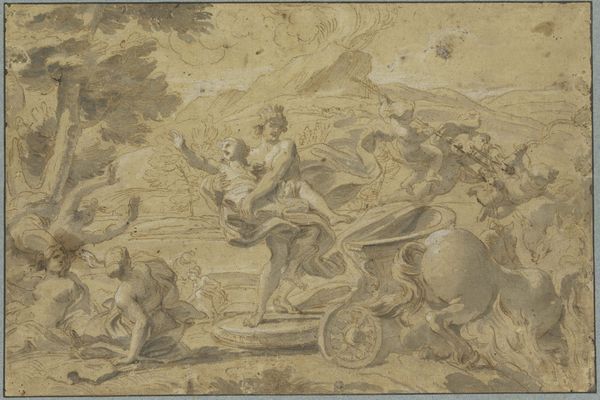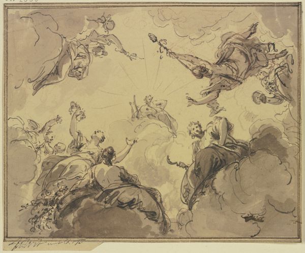 Editor: So this drawing, "Saint Joseph Presented by the Virgin to the Holy Trinity," is by Corrado Giaquinto, made sometime between 1730 and 1740. It's ink on toned paper. It’s a whirlwind of figures in the sky! What's the historical significance of a piece like this? Curator: Considering its place within the context of art and power, we need to think about its purpose. These sketches are hardly made for casual appreciation, but most often exist as studies or *modelli*. It seems that Giaquinto would be trying out various compositional schemes in preparation for a larger, probably painted, altarpiece. Editor: Interesting! It wasn't really meant for public viewing then? Curator: Not in this form, at least. Think of the patronage system at the time. Works like this would likely be viewed by a patron, perhaps someone connected to the Church, before being approved to create the final altarpiece. They could offer commentary and affect the final composition by sharing their ideas and political motives. Editor: That’s a really important perspective. I never thought about the direct influence patrons had on even the preparatory sketches. Did the public even know about this approval process? Curator: Only to a limited degree, since these stages of negotiation and artistic development occurred mostly in the private sphere. Nevertheless, we have a chance to understand the ways in which art reflects, or even constitutes, power. Editor: Right. It shows that even art with a religious theme isn’t detached from the social and political landscape of its time. This altarpiece wasn’t necessarily just a reflection of someone’s religious devotion, but more so a demonstration of political status and its relation with the church. Thanks, I definitely have a more nuanced appreciation now. Curator: It's fascinating how unpacking the historical context allows us to see these drawings, not just as sketches, but as documents reflecting a very particular dynamic of art-making.