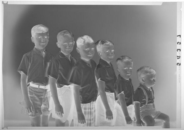Curator: This is an untitled studio portrait by Martin Schweig of six young boys arranged from tallest to shortest. Editor: Oh, it's like a little staircase of sweet faces! But in reverse… a photographic negative. Curator: Exactly, and the materiality of this photograph is interesting. Notice the negative's edges, with the Kodak markings visible—it reminds us of its manufactured nature. Editor: It feels like a tender social study, a commentary on childhood and societal expectations of order and conformity. The negative look lends an eerie cast on the portrait. Curator: Indeed. It also encourages us to consider the labor involved in photography, from image capture to development. Editor: You're right, all that behind-the-scenes toil… I almost missed the beauty in the seemingly simple. A touching, but also slightly unsettling piece overall. Curator: Yes, seeing the process helps us appreciate the final image more.