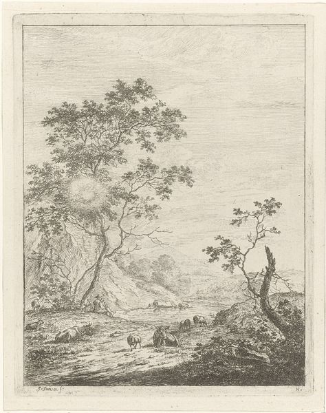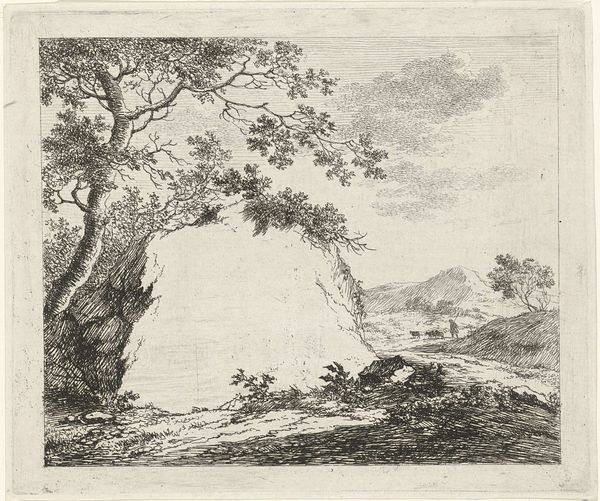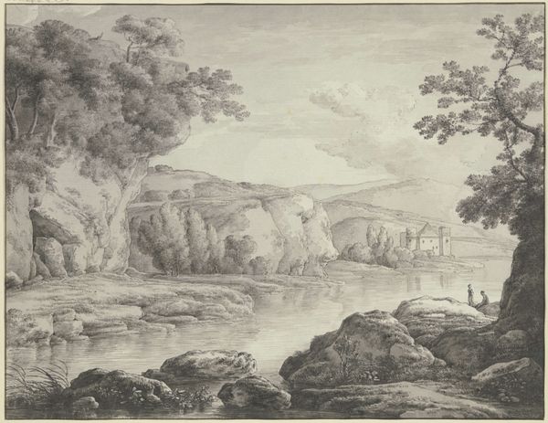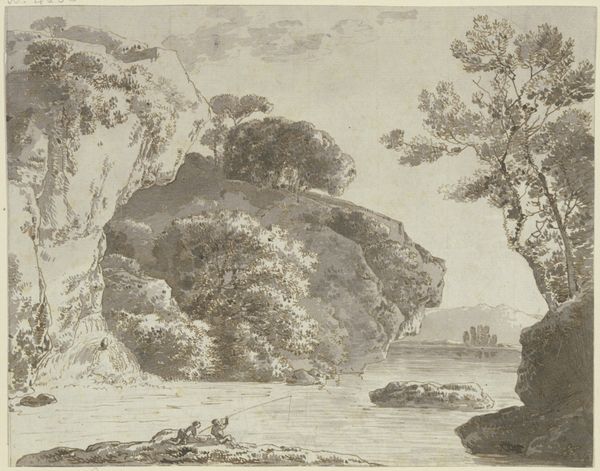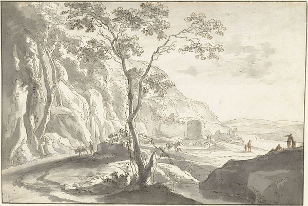 Editor: Here we have Jan Both's "Italiaans landschap," created sometime between 1628 and 1652. It's a drawing, seemingly in graphite and maybe watercolor on paper. There's such a tranquil mood to this landscape; I'm drawn to the layered composition and soft light. What do you see in this piece, from your perspective? Curator: Looking at the process is key here. Consider the materiality: graphite and watercolor. They are easily transportable. The paper support itself points to the artist’s mobility, suggesting sketches *en plein air*, directly engaging with the landscape as raw material. Editor: So, the ease of use of the materials connects directly to the artist's experience? Curator: Exactly. Both, like many Dutch Golden Age artists, travelled to Italy. But why? What material conditions allowed for this? We have to consider the burgeoning art market back in the Netherlands. Demand for Italianate landscapes fueled production. These sketches weren’t just aesthetic exercises. Editor: You're saying it's not just about pretty scenery; there's a business aspect to it as well? Curator: Absolutely. Both was producing a commodity. Consider how these "pencil drawn" or "pencil sketch" landscape artworks entered the collectors' hands, their display settings. The labor involved is worth mentioning; artistic workshops, and how landscape artistry played a part in cultural and economic consumption. The materials and process aren't separate from the social and economic context. Editor: That’s a great point. I was so focused on the artistic aspect, I didn't consider the full picture of material production and market demand behind this “sketch”. Curator: Exactly. It's about deconstructing that divide, understanding the networks of production and consumption. Editor: I'm definitely going to view landscapes differently now. It makes you think about the who, how, and why, instead of just the what!