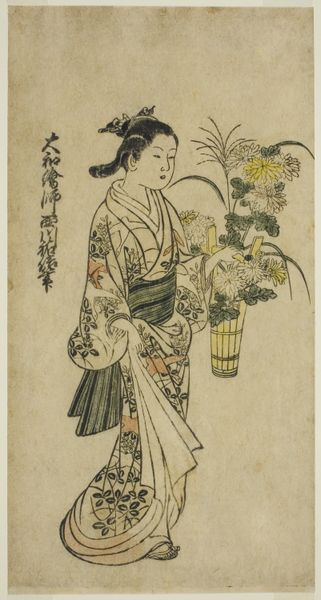 This woodblock print, made by Torii Kiyomitsu in Japan around 1760, depicts the actor Anegawa Daikichi in the role of Ayame no Mae. The image connects to the wider social and cultural context of the Edo period when the theatrical world of Kabuki flourished as a popular entertainment for the merchant classes. The image creates meaning through visual codes that would have been easily recognized by contemporary audiences. The actor's elegant pose, elaborate costume, and the stylized maple tree reference specific elements of the play. The theater district in urban centers such as Edo or Osaka became important centers of commerce and amusement. Kabuki actors enjoyed celebrity status. These prints were, in effect, publicity material, ways to popularize the actors and the plays in which they appeared. To understand this print better, research into the social history of the Kabuki theater, the role of actors in Japanese society, and the development of woodblock printing as a commercial enterprise would be invaluable. The meaning of art is always contingent on its social and institutional context.