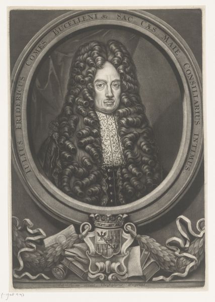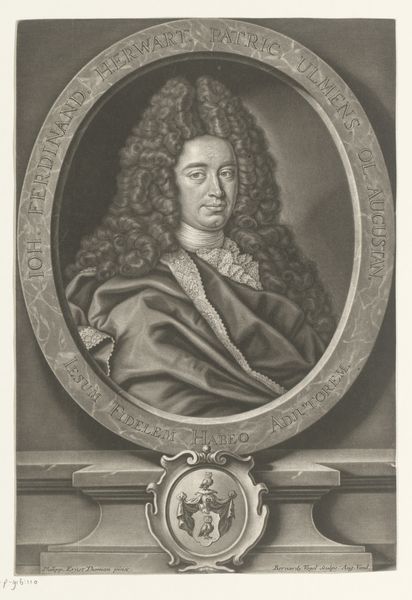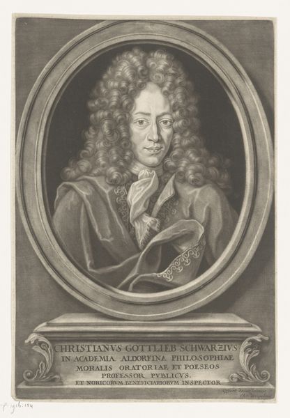 Christoph Weigel created this print of Eucharius Gottlieb Rink, a professor of public law, sometime between 1654 and 1725 using etching and engraving techniques. The image is carefully constructed to convey power and status, a visual language which was crucial in the hierarchical societies of the era. Rink's elaborate wig, lace collar, and draped robe all signify his position and education. Yet, these symbols of authority also speak to a very specific kind of masculinity, one steeped in intellectualism and courtly presentation. Consider how the expectations for men in positions of power have changed since the 17th and 18th centuries. While Rink would have been seen as a figure of respect and authority, today, the same symbols might be viewed differently. This image not only reflects the identity of its subject but also offers a glimpse into the performance of masculinity and power in a bygone era.