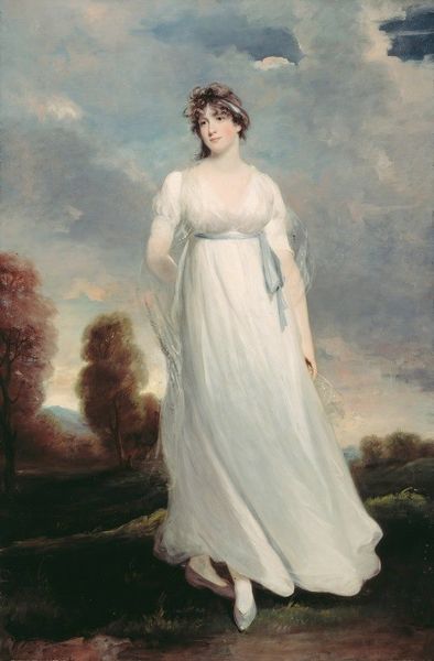 Editor: This is "Miss Elizabeth Haverfield," an oil painting from the early 1780s by Thomas Gainsborough. It has this delicate, almost ethereal quality to it. What jumps out to you, in terms of its deeper meaning? Curator: I’m struck by how Gainsborough uses the symbolic language of nature. Notice how Miss Haverfield is positioned amidst the flora. Flowers, particularly in portraits, carry immense weight. They're never just decorative. Do you get any sense of what those specific blooms near her could signify? Editor: I hadn't considered that. They're sort of delicate, with muted colours… innocence, maybe? Curator: Precisely. The choice of surrounding her with specific botanical imagery reinforces a vision of purity, youth, and a connection to the natural world. And her hat? Editor: It looks rather ornate, with so many ribbons, it is competing with the simplicity of the flowers, actually. Curator: Absolutely! The contrast embodies the duality of her position in society – both natural and cultivated. She is both a part of nature, yet also a symbol of social status, don't you think? Do you find any contemporary resonances in this contrast? Editor: Definitely! It makes me think of the tensions women face today, between expectations and authenticity. So, her gaze, the flowers, the clothing - it's all part of a language that creates this incredibly nuanced image. Curator: Indeed. Gainsborough wasn’t just painting a likeness; he was constructing a symbolic representation of femininity, innocence, and social identity that continues to resonate across centuries. Editor: I never thought a portrait could contain so much hidden language. I'll never look at another painting the same way again. Curator: That is exactly how the magic of symbolism works. Once noticed, it's everywhere.