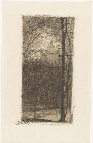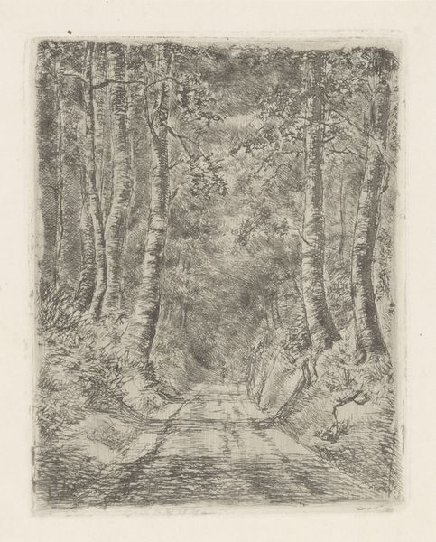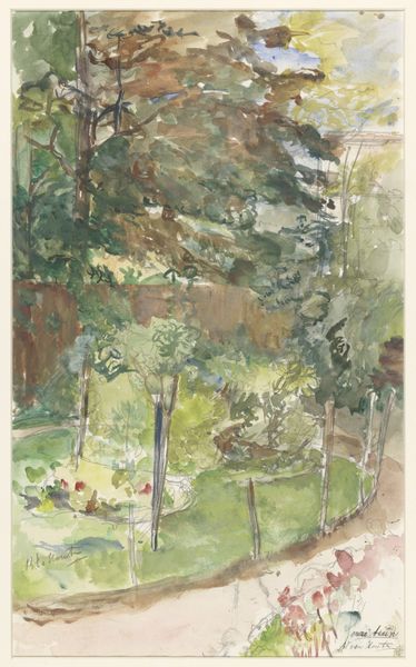 Editor: So, this is "Laan met hoge bomen" or "Avenue with Tall Trees," a watercolor created between 1870 and 1920 by Willem Wenckebach, currently at the Rijksmuseum. It feels like a liminal space – a path leading somewhere, but shrouded in mist and tall trees. What stands out to you as you look at this watercolor? Curator: Immediately, I'm struck by how the trees function almost as sentinels, guarding a path into the unknown. Notice the use of muted colours; they create a contemplative atmosphere. In many cultures, forests symbolize the subconscious, a space of introspection. Do you think the lone figure is venturing into that symbolic space? Editor: That’s a fascinating perspective! I hadn't considered the forest as a representation of the subconscious. It could be, given how the path seems to fade into the mist. I had focused more on the slightly off-center composition. Curator: And that off-center composition subtly disrupts the sense of perfect balance, perhaps mirroring the uncertainties of life's journey. What emotions does that evoke in you? Do you connect it to a universal experience? Editor: I suppose there's a feeling of solitude and perhaps a bit of mystery. It resonates with the feeling of walking into an unknown future. The impressionistic style almost abstracts reality. Curator: Exactly. That abstraction invites us to project our own hopes and fears onto the scene, connecting with the work on a deeply personal level. The path also guides your eye. Consider what you think of when considering how landscapes serve as both records and containers of our experiences. Does the lone figure also play this part? Editor: I never thought about a simple painting containing so much history and depth, or the intersection between my experience and the collective! Curator: Precisely! Visual symbols remind us of shared memories, evoking introspection.