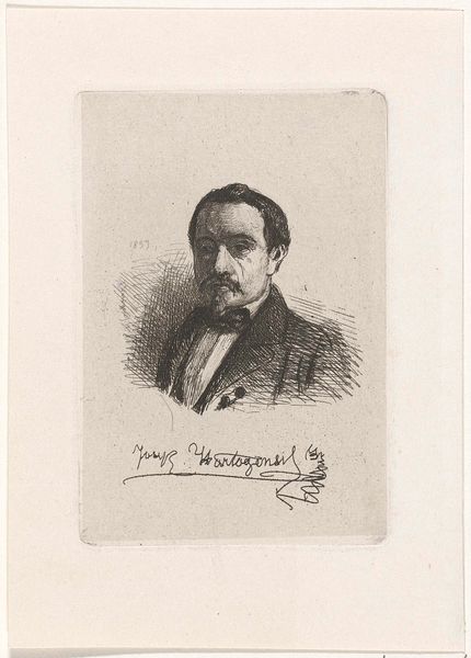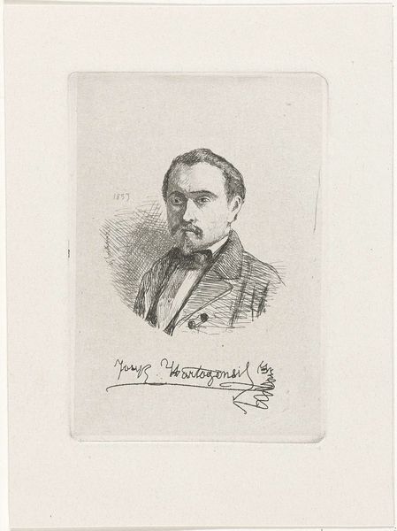Curator: Up next, we have Joseph Hartogensis' "Self-Portrait," an etching done in 1857 and currently held at the Rijksmuseum. Editor: It's strikingly intimate, wouldn't you agree? There's something about the fineness of the lines and the way the shadows play across his face that feels so immediate. A pensive moment captured, maybe? Curator: I'd say so, but the "why" is equally interesting. The rise of self-portraiture was heavily shaped by the democratization of art. As artists sought more control over their image and legacy within an art market, producing and disseminating your own image through prints like this gained traction. Editor: Absolutely, and within that power dynamic, who gets represented is crucial. How does his class and profession intersect with visibility and self-representation here? Is there something radical about a man in his position choosing to make his image available in this way? Curator: He was indeed well-connected, from a family heavily involved in public life. During this time, history painting was really championed by museums, so this also suggests a negotiation, or merging, of the personal and public sphere. The "who" and "why" of that accessibility seem key to how we engage with the artwork today. Editor: Fascinating. And this etching process itself speaks to broader accessibility—allowing for the reproduction of images beyond singular paintings for the wealthy elite, although his signature would still ensure the print had a distinct, exclusive value. This piece isn’t just about who Joseph Hartogensis was; it’s also asking us to consider how art shapes social dynamics. Curator: Exactly. What seems simple at first glance – a portrait in lines – can tell a lot. The politics of imagery. It’s something that speaks so heavily to the present, in terms of social media and representation. Editor: The questions this self-portrait raises remain urgent for today’s audiences as well, as we’re all called to reflect on who is seen, who has the agency to see, and who controls the narrative. Curator: Absolutely, it's fascinating how looking into the past through these self-made images provides a clearer understanding about present power structures, gender, class, and social representations in art and life.