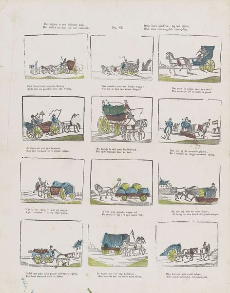 This print, made by Theodorus Johannes Wijnhoven-Hendriksen in Rotterdam, is comprised of engravings on paper, embellished with watercolor washes. The imagery is carefully delineated, demonstrating the artist's mastery of line. Each scene shows a horse-drawn carriage, rendered with a somewhat naive charm; the flat planes of color add to this effect. The artist was clearly familiar with a variety of horse-drawn vehicles, from hay wains, to military transport, to luxurious passenger carriages. These were essential to the Dutch economy and class structure. Note that the artist also identifies himself as a book and print maker, suggesting a canny understanding of the publishing market. Ultimately, this modest print offers a glimpse into a society reliant on animal power, and a commercial ecosystem that gave images broad circulation. We should remember that, long before digital media, it was prints like this that brought images into many people’s lives, outside the elite world of painting.