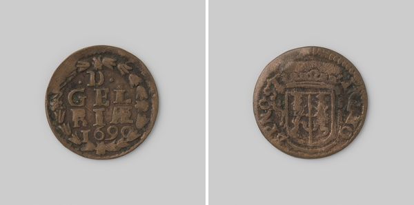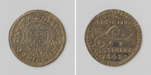 Editor: Here we have an intriguing piece from 1571: a silver Utrechtse twintigste philipsdaalder commissioned by Philip II. The small scale and geometric divisions give the whole coin an overall structured feel, almost like a puzzle. What visual elements stand out to you? Curator: The most striking element is the division of the surface. Observe how the central heraldic shield, crowned and elaborately quartered, dominates the composition. This is further accentuated by the rigid circular inscription around its perimeter. There's a tension created between the implied flatness of the coin itself and the depth suggested by the heraldic details, isn’t there? Editor: Definitely. The level of detail crammed onto such a small surface is amazing. It’s a tiny object, but feels monumentally symbolic. How does the material contribute to its reading? Curator: The use of silver is paramount. Its reflective surface interacts with light to reveal or conceal the finely engraved lines, drawing our eye in and guiding our gaze. Also, note the slight imperfections, signs of wear, on its edge – they provide contrast against the precision of the coat of arms. Editor: It's almost as if the wear gives it more… authenticity? It suggests history. Does the symmetry affect its aesthetic? Curator: Absolutely, symmetry is critical to conveying order and authority, vital for projecting an image of power, don’t you agree? However, it’s not a perfect symmetry. Subtle variations and hand-tooled inconsistencies create visual interest and reveal its production. Editor: So, form and content are totally intertwined? Curator: Precisely! The relationships between material, structure, and surface treatment communicate directly with us. I have learned from our brief exchange today about the effect wear has on the authenticity of the work. Editor: Me too! This was fun! I never thought so much could be derived from a coin!