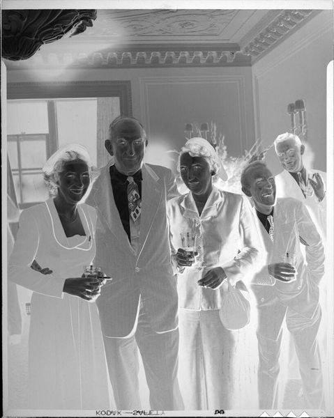 Curator: This gelatin silver print, currently held at the Harvard Art Museums, is simply titled "Untitled (man and two women standing at party)" by Peter James Studio. It strikes me as quite festive. Editor: It's interesting how the photographic process, the chemicals and paper stock, can evoke such a strong feeling of time. This feels like mid-century America. Curator: Absolutely. Looking at the attire and considering the era, I'm drawn to the potential social dynamics at play in this gathering. What power structures do you think are being reflected in the scene? Editor: Consider the texture of the wall behind them, probably marble, and the clothing: these are all things that were produced, made, bought, and consumed. They provide insights into the economic conditions of the time. Curator: Indeed. I find myself wondering about the untold stories of these individuals and how their identities intersect within the context of the photograph. Editor: The image makes me think about the materiality of social life and how that gets represented through photography. Curator: A powerful reminder that every artifact holds layers of meaning. Editor: Quite right, layers produced and consumed.
