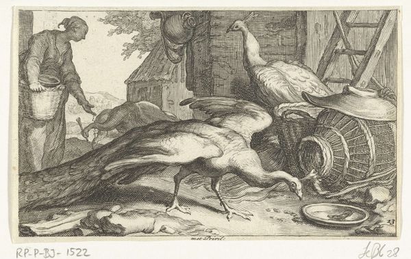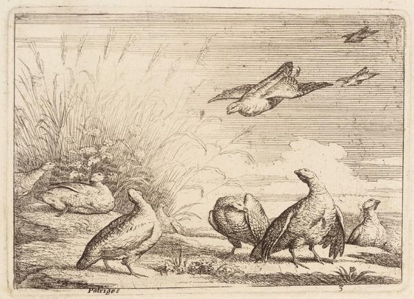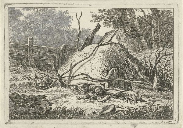 Editor: We are looking at "Zwijnen bij een hok," or "Pigs by a Sty," an etching dating from around 1654 to 1670, by Richard Gaywood, currently held at the Rijksmuseum. There is something very domestic, almost portrait-like, about the animals despite being in a pastoral setting. How do you interpret this work? Curator: The beauty of this piece, as with much of Dutch Golden Age art, lies in its technical execution. Consider the linework: economical yet descriptive. Note the clear separation between the space occupied by the nursing pigs under the sty, and the lone animal drinking; between the foreground, the immediate setting, and the subtle indication of open fields and other creatures in the distance. Do you see how line directionality, density, and pressure communicate spatial depth as well as textures? Editor: Yes, I see that! So it’s less about what the subject matter *is* and more about *how* it’s rendered? Curator: Precisely! Observe how Gaywood employs hatching and cross-hatching to generate tonality and shadow. Where does he concentrate the densest patterns of line, and what effect does this produce? How does he vary his marks? What does the interplay of light and dark achieve? The entire composition works as a structured visual scheme to emphasize form and suggest volume. Editor: He uses more dense lines where the light is blocked, like within the shelter where the sow and piglets huddle, creating darker values which creates a focal point. Also, there’s very little detail in the sky. It gives a sense of expansiveness. Curator: Exactly. The reduction of details for sky and distance allows for concentrated focus on the foreground activities of these animals and this sheltered enclosure, emphasizing the present and tactile. Editor: I never thought about prints this way. Now I see how powerful the compositional structure can be. Curator: Indeed. Focusing on its formal properties gives us insights into how it operates aesthetically, how it communicates visual experience in the here and now.