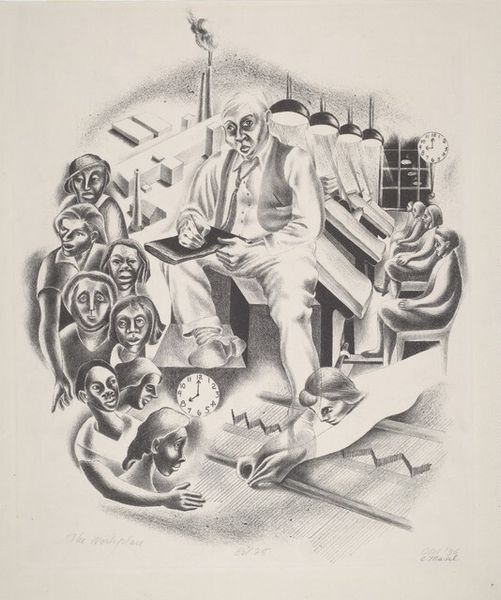 Curator: Here we have Abraham Joel Tobias's print, "Bombardment," created in 1939. The medium itself, a stark black and white print, contributes significantly to the artwork's emotional power. What's your first impression? Editor: Utter devastation. It’s like a dark Renaissance painting—grief and geometry colliding. The central figure, a woman with a child, seems suspended in a bubble of tenderness amidst total collapse. Curator: Absolutely. Notice how Tobias utilizes geometric shapes and stylized figures? This reflects not just the influence of modernism but also potentially connects to the socio-political climate of the time. Think about the looming Second World War and the mechanization of warfare. Editor: Yes, there’s a sense of industrial horror underlying the whole piece. But the print medium is interesting—it democratizes the image, mass producing the grief. I almost want to touch it to see how the ink sits on the page. It's visceral. Curator: Indeed. And consider how printmaking allowed Tobias to distribute this message widely, making it accessible beyond the confines of a gallery or museum. This aspect challenges traditional notions of high art by grounding the piece in a broader social context. Editor: I can’t help but focus on that central mother and child. She embodies a plea, doesn’t she? Almost like a modern-day Madonna offering humanity one last embrace before the end. Her fragility is what lingers. It feels unbelievably intimate despite all the angular despair around her. Curator: That's insightful. And to bring it back to materials, the contrast achieved through the printmaking technique – the bold lines, the areas of shadow – accentuates that tension, the impending destruction juxtaposed with the vulnerability of human connection. Editor: Well, that mix of tenderness and terror has definitely left its mark. The world was clearly on the edge of something awful back then, and Tobias captured it in that mother's gaze. Powerful. Curator: It speaks to the way art, especially printed art, can reflect, respond to, and even attempt to shape our understanding of momentous historical events and human cost.