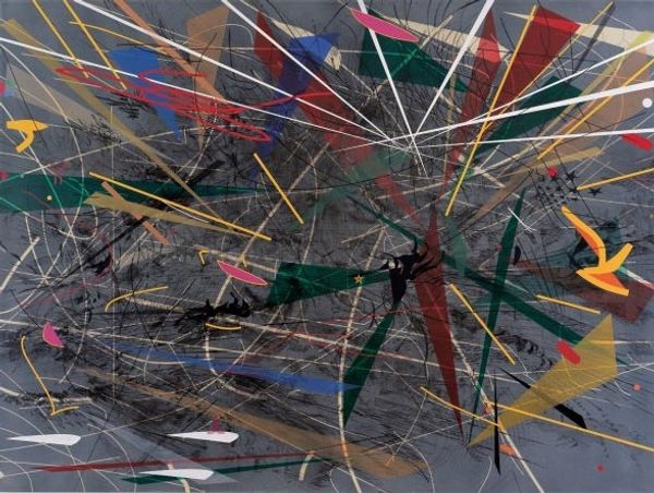 Editor: Right now we're looking at Julie Mehretu's "Excerpt (Suprematist Evasion)" created in 2003, using acrylic paint. The sheer energy in this abstract work is astounding, almost like a burst of light and color. How do you interpret this work? Curator: For me, it speaks to the power of geometric forms, recalling Malevich's Suprematism, but with a frenetic energy that suggests something else entirely. Look at the layering— it's a visual record, a kind of palimpsest of urban experience. Do you see how the lines and shapes seem to simultaneously converge and explode outward? Editor: Yes, there's a sense of movement, like a city being built and destroyed at the same time. Is that what you mean by urban experience? Curator: Exactly. Mehretu’s work often engages with the layered complexities of urban landscapes. The Suprematist title hints at a break from established orders. These shattered geometric shapes feel like a revolt against rigid systems. Do you recognize how certain lines are bolder and more prominent than others? Editor: Yes, those lines stand out. Curator: Perhaps representing major arteries or pathways through our mental cityscapes, personal mythologies projected in a collective manner. How do the colors impact you, and their role in guiding your sight? Editor: I feel the yellows and reds draw the eye through what would otherwise be chaotic. The blue feels colder in the background... so you see those are emotional signals too, maybe? Curator: Indeed. Notice how the vibrant, assertive lines clash with the paler background, evoking a struggle or tension between different layers of history and experience. They can exist harmoniously, so where is the rupture occurring for you, personally? What historical symbols feel challenged or lost? Editor: That’s such a helpful insight – it definitely reframes my initial feeling of just raw energy. Now I am pondering personal memories, even social anxieties projected onto a wider historical perspective. Curator: And, to me, this artwork remains fascinating to see evolve our conversation within us as it speaks to others, continually changing, challenging us, making art still alive.