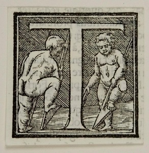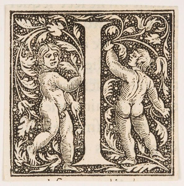Curator: Here we have "Letter L" by an anonymous artist, currently held in the Harvard Art Museums. Editor: It’s… playful! The bold letter intertwined with these chubby, almost wrestling figures creates a striking, slightly humorous effect. Curator: Indeed. Letterforms as art became popular with the rise of print culture. Consider the social function of alphabets—disseminating knowledge, standardizing language. Editor: But these figures—they feel subversive, maybe critiquing the stoic seriousness often associated with academia and institutions of learning. Are they challenging the rigid structure of the alphabet? Curator: Perhaps. Or maybe celebrating the human form, integrating it into the very foundation of communication. It reflects a society embracing humanist ideals. Editor: Either way, it's a dynamic commentary on knowledge, bodies, and the systems that bind them. Curator: A fascinating convergence of form and function.