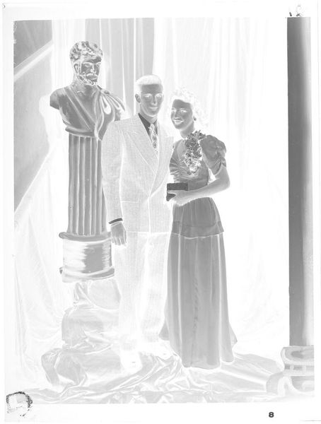 Editor: This is an intriguing gelatin silver print by John Deusing, simply titled "Untitled (portrait of boy and girl in studio)." It's ghostly, almost like looking at a memory. What do you make of its ethereal quality? Curator: It feels like peering into a half-forgotten dream, doesn't it? The inverted tones give the figures an otherworldly presence. I see the formal attire, the boy with his cane, the girl with her bouquet. Perhaps a staged photograph, a memento of a special occasion? There is a beauty in the unreal. Editor: Memento is a good word for it. It's certainly a different way to capture childhood. Curator: Yes, the artist flips the script on traditional portraiture. It isn't about perfect likeness, but about capturing the fleeting nature of time and memory. Food for thought, isn’t it?