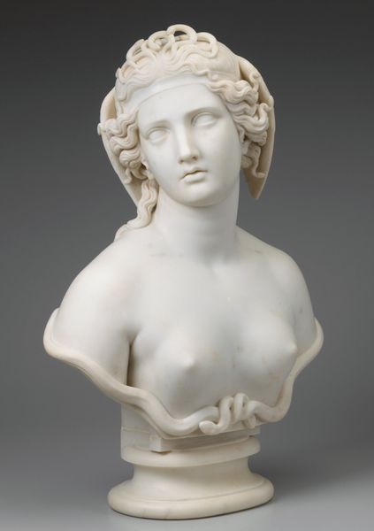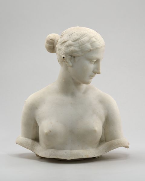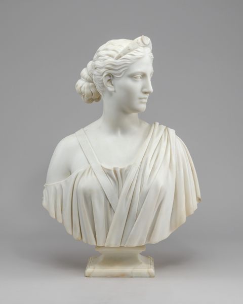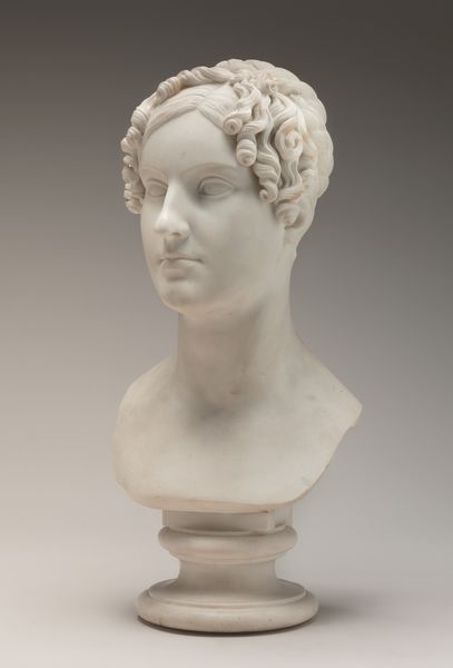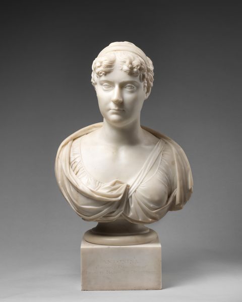 Editor: Standing before us is Hiram Powers' marble sculpture, *A Country Woman*, created around 1838-1839. She has such a serene expression, almost like an idealized portrait from antiquity. What resonates with you when you look at this sculpture? Curator: This piece evokes the complicated intersection of neoclassical idealism and American identity. The smooth marble, the idealized features – these clearly echo classical Greek sculpture, aligning the sitter with ideals of beauty and virtue that Western art inherited from classical antiquity. Editor: I see that too, it's so clearly influenced by classical sculpture! Curator: Exactly! Powers, like many artists of his time, aimed to elevate his subjects, and in this case, to give dignity and grace to the figure of a rural woman. But there is a layering here too, a claim for America’s connection to the classical world, framing the “common” woman within a powerful visual language. The way her hair is styled, pulled back, braided -- these stylistic decisions pull away from high fashion to project an air of virtuous simplicity, linking her visually to a type rather than a specific person. Editor: It's fascinating how those deliberate choices shape our understanding of her character, it is like her image tells a kind of folk story. Curator: Precisely! Can we even know the real identity of this woman? She functions more as a symbol than a true portrait. But for whom is this symbolism? Who gets to construct a meaning for the people in this way? Editor: That is such a profound point about who has the authority to interpret and assign meaning to representations of others. Curator: I think Powers would be thrilled we're still contemplating those questions. Editor: It’s definitely given me a lot to consider about portraiture and representation!
