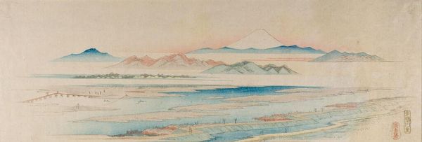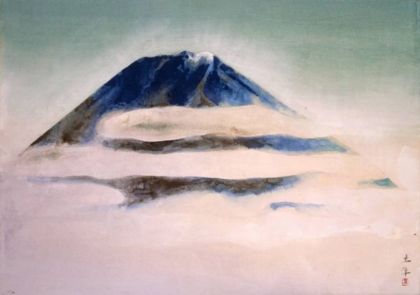 Curator: Before us, we have "Fuji Blue," a print by the celebrated Japanese artist, Hokusai, held here at the Guimet Museum. Editor: It's strikingly serene. The muted blues and the stark white peak... it has a quality almost like a dream, distilled into form. Curator: Hokusai, of course, is most famous for his series "Thirty-six Views of Mount Fuji". It really cemented the mountain as a symbol of national identity in Japan. The printmaking process also allowed these images to circulate widely, shaping how people understood both art and their connection to place. Editor: The composition, too, is fascinating. That sweeping curve leading up to the summit. There's almost a graphic simplicity to it, belying the incredible skill involved in carving those woodblocks. Curator: Indeed, and the ukiyo-e tradition which Hokusai mastered served both commercial and aesthetic functions. Think of them as early examples of mass art consumption, produced for a public eager for images of scenic spots and idealized landscapes. This image shows his strong understanding of atmospheric perspective to imply a deeper picture plane. Editor: Looking closer, the application of color is superb, especially the subtle variations that suggest shadow and depth. Notice how the base almost dissolves into the surrounding landscape with that field of dense and seemingly tiny trees in black. There is such subtlety to its material handling! Curator: And consider its broader cultural resonance. This was a period of intense social and economic transformation in Japan, and these images offered a romanticized vision of the country, reinforcing ideas of natural beauty. They were purchased as souvenirs by those taking the pilgrimage up the holy mountain. Editor: A compelling marriage of form and content, wouldn't you agree? A visual treat that speaks to the political and social realities of its time. Curator: Exactly. It shows that something beautiful can be the carrier of historical messaging. Editor: A worthy print in understanding the world's diverse artistic output, while honing one’s aesthetics, too!