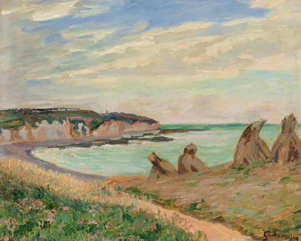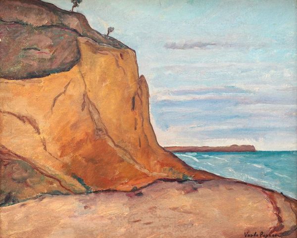 Curator: Welcome. Before us is "Bovbjerg ved solnedgang. Efterår" which translates to Bovbjerg at Sunset in Autumn. Painted in 1934 by Niels Bjerre. The artist renders a landscape in oil on canvas, a medium common in the Plein-air style. Editor: The scene is quite melancholic. The muted color palette creates a palpable atmosphere of stillness. It feels like a moment suspended in time, just before darkness fully descends. Curator: Indeed. Note how Bjerre’s impasto technique and visible brushstrokes create texture in the foreground, offering a dynamic interplay of light and shadow across the cliffs. Consider the structure within the planes, contrasting with the soft gradient in the sky. Editor: Yes, there's something about the high vantage point that implicates you, the viewer, into the social scene taking place on the shore. Did Bjerre position the cliff deliberately to highlight a communal connection between the inhabitants and their surrounding nature? Curator: An intriguing question, although my attention turns to the visual rhetoric here. The receding waves act as a signifier of the constant passage of time. The contrasting permanence of the cliffs speaks to a dialectic that, upon semiotic breakdown, offers the viewer an internal discourse with the nature of mortality itself. Editor: You find permanence in the cliffs, I see only an erosion, in constant change by social policy over time, shifting access to resources by the locals. Curator: A compelling social analysis. But the power of Bjerre’s application here… it is the universality, and it's timeless construction, where he transcends the immediate social climate to engage with primal concepts, I would suggest. Editor: Maybe, but remember artworks don't exist in a vacuum, do they? Either way, it’s undeniable that Bjerre's work encapsulates the moodiness of the coastal environment of the time, capturing a unique perspective on this local community and its placement. Curator: Precisely. Through his artistry, Bjerre distills the landscape down to its essential components. Editor: Components both cultural and painterly... a captivating juxtaposition of society and the land.