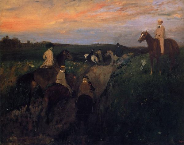 Editor: This is "Race Horses at Longchamp" by Edgar Degas, created in 1874, and it’s an oil painting. I’m struck by the way he's captured the light, this hazy, golden atmosphere before the race. The composition seems almost photographic, with the horses cropped in an unusual way. How do you interpret this work, focusing on its formal qualities? Curator: The photographic quality you mention is astute. Note how Degas has flattened the space, prioritizing the surface of the canvas. The recession into depth is ambiguous, created primarily through subtle shifts in tone and the diminishing scale of the horses. Consider also how the asymmetrical composition—the empty foreground balanced by the crowded middle ground—creates a sense of dynamism, even anticipation. It is almost a study of contrasts and asymmetry. Editor: That's fascinating! I see how the colour palette also contributes to that atmosphere, dominated by muted greens, browns and yellows, punctuated by the vibrant colours of the jockeys’ silks. Are the shadows also constructed to serve as contrasting components within the larger image? Curator: Precisely. The shadows, though subtle, contribute to the overall tonal arrangement. They delineate form but are not naturalistic. The colour serves to subtly advance and recede parts of the scene, emphasizing the planar quality of the image. This focus on formal relationships—colour, line, composition—was a key aspect of Impressionist theory. Notice how those vertical strokes of the blades of grass are like musical notation that tie the composition together. Editor: I’ve definitely learned a lot, understanding the significance of what Impressionists tried to do beyond portraying everyday scenes. The focus on surface and formal relations gives a completely new way to appreciate the artwork! Curator: Indeed! By analyzing the formal elements, we gain insight into the artist's intentions and how the artwork communicates its message. I trust it will guide how we both see artworks now.