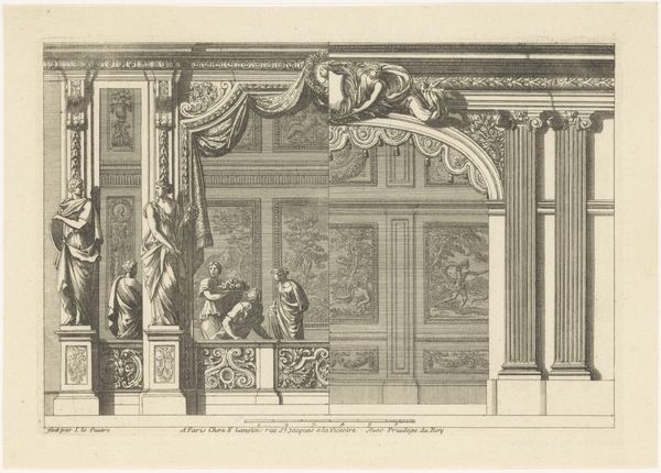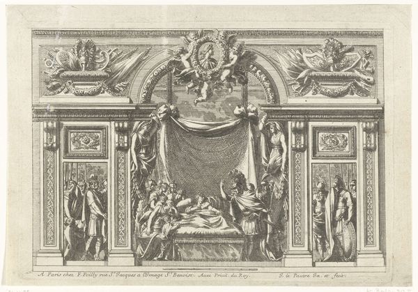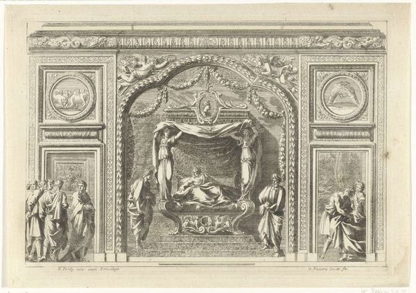 Curator: This intriguing engraving is titled "Alkoof afgesloten door balustrade," or "Alcove closed by balustrade" created before 1690 by an anonymous artist. Editor: It looks like a theatrical backdrop! Stark, formal...the drama unfolding in a silent way. Curator: That’s an interesting observation, the baroque style truly lends itself to theatrical presentation. Let's examine its structure. Notice the carefully delineated planes, how the artist has meticulously rendered the architecture to suggest a sense of depth. Editor: I see that. And all the embellishment...the cherubs peeking from above, the figures flanking the alcove, portraits at the very edges like witnesses or players. But it feels remote, detached. Curator: Indeed. This work uses allegory, history, architecture to talk about the closed alcove. Think about what that space means historically...Privacy, secrets, contemplation or even conspiracy all held at bay by this beautifully rendered architectural composition. Editor: Right! But it makes me question the material too. I mean, why a print? What kind of intimacy could a print really evoke. The medium feels...clinical. Curator: Well, engravings like this would have allowed for much wider dissemination of architectural styles and ideas, sort of a proto design magazine! And I see those figures flanking the alcove with less formality – perhaps guardians, protectors, giving me a deeper connection. Editor: I see your point about design. It invites analysis, which, in turn, fosters awareness of our experience within space and makes the viewer an informed consumer. Curator: Ultimately, isn't that the magic of a compelling artwork: whether it be a quiet bedroom or one filled with spectacle. Editor: In its quiet way, this alcove feels oddly defiant. Almost rebellious in the stillness. Fascinating.