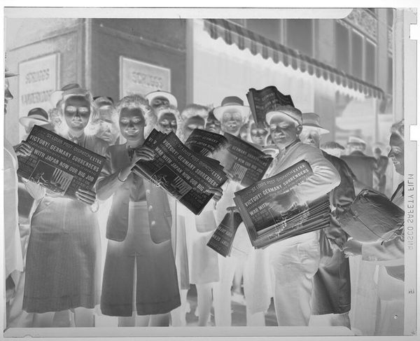 Curator: Jack Gould's photographic print, simply titled "Untitled," captures a crowd fixated on a paper in a shop window, likely on VE Day. Editor: The inverted tones give the image a ghostly, almost dreamlike quality. It mutes the joyous occasion one might expect. Curator: Indeed, the greyscale emphasizes the shared act of reading and witnessing history unfold. The composition is striking, with the receding planes of faces. The shop signs above add layers of cultural context. Editor: I'm drawn to the expressions – the tension, the weight of expectation on those faces. It goes beyond the simple announcement and speaks to collective experience. Curator: I agree, the photograph highlights how public spaces become sites of shared national identity and collective memory during pivotal historical moments. Editor: Precisely. It is a testament to the power of a single piece of paper to unite a community.