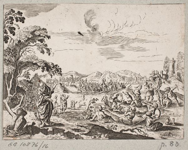 Curator: Looking at this, my first thought is "relief." The fine lines give a sense of almost fragile hope rising after such utter devastation. Editor: It’s interesting you say that. We're looking at "God enters into a covenant with Noah," an engraving by Crispijn de Passe the Elder, dating back to 1612. It’s part of his "Liber Genesis" series and currently resides at the Metropolitan Museum of Art. Considering the context of its creation, that feeling is really amplified, isn't it? Europe was no stranger to calamity at the time. Curator: Absolutely. The delicate nature of the lines used to depict such a grand moment, the rainbow, the ark in the distance barely suggested…it all feels very tentative, a promise whispered rather than shouted. I mean, look at the faces; they're etched with worry even amidst gratitude. Editor: Exactly, that covenant is far from a simple absolution. The rainbow itself is a powerful symbol. We often see it now as this emblem of inclusivity, but within the religious context that De Passe was working in, it's a potent reminder of divine power and the potential for future destruction. A fragile promise indeed, draped over a society still reckoning with massive losses from flood, as well as famine, plague, and persistent religious wars. Curator: Right. And you see the animals slowly making their way back into the world—almost comically, in such precise little strokes. But there's a beauty there too, a stubborn refusal to yield. It mirrors human resilience. Editor: That element of perseverance resonates powerfully. When placed against the backdrop of historical crises and societal inequalities, it underscores art’s critical ability to visualize not only moments of celebration, but also the weight of collective trauma and the cautious navigation of the future, of renewed promises. Curator: It's more than just a biblical story, isn't it? It’s about rebuilding in the aftermath, about faith flickering in the darkness, and the difficult journey to find solid ground again. Editor: And finding solidarity amidst that rebuilding, recognizing the spectrum of emotions inherent to healing.