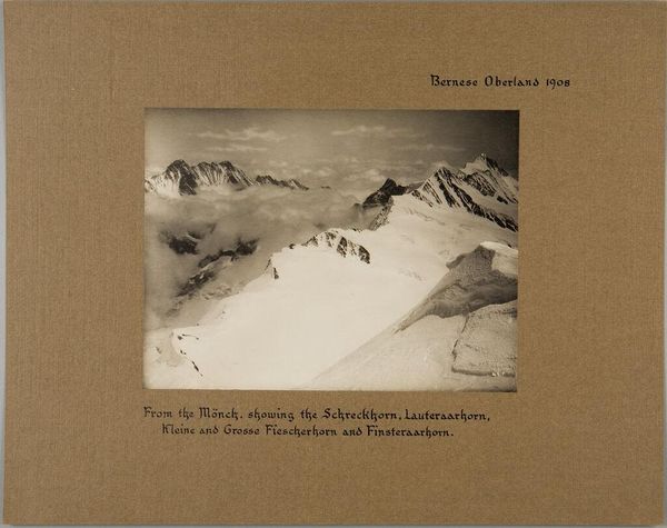 Curator: This photograph, "From the Kalli, showing the Schreckhorn and Lauferaarhorn, Bernese Oberland," was captured by George Perry Ashley Abraham. Editor: It's striking how the starkness of the snow contrasts with the jagged, almost menacing peaks in the background. Two tiny figures make the scale imposing. Curator: Absolutely. Abraham, a member of the Alpine Club, used photography to document the sublime, capturing not just geographical features but also the human experience within them. This image likely served to promote mountaineering culture. Editor: The figures, dwarfed by the landscape, are such crucial symbols. Perhaps it's meant to signify the insignificance of humans in the face of nature's grandeur. Curator: Or to celebrate human aspiration, and the will to confront the forces of nature. Images like this romanticized mountaineering, transforming it into an almost spiritual pursuit. Editor: It's so interesting how photography, then as now, both reflects and shapes our understanding of nature and our place within it. Curator: Indeed, it offers a lens—both literal and figurative—through which we project our values onto the landscape.