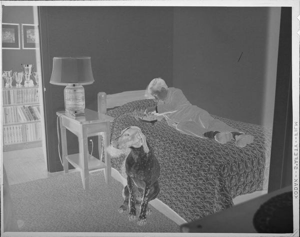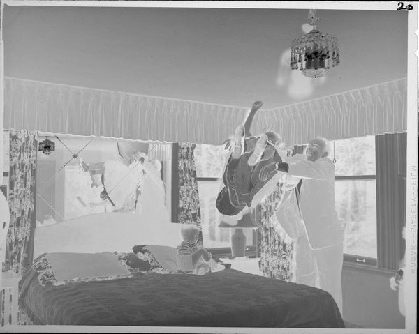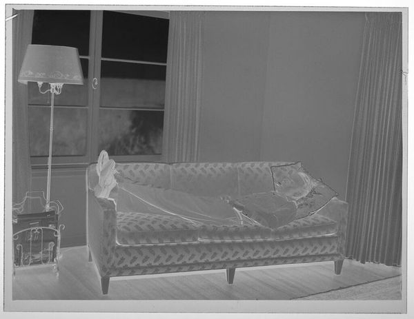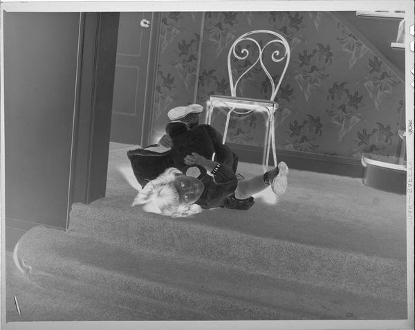 Curator: This gelatin silver print by Martin Schweig captures a young boy embracing his sister, both in pajamas, within a domestic space. Editor: The inverted tones create an unsettling mood, almost ghostly. The composition itself, however, is quite balanced, with the children centrally framed. Curator: Indeed, the ghostly effect speaks volumes about memory, loss, and the often-strained representation of children within the private sphere. Consider the power dynamics implicit in such a staged, intimate moment. Editor: The textures are fascinating too. The stark contrast emphasizes the soft fabric of the pajamas against the harder lines of the brick fireplace. A nice interplay there. Curator: We see echoes of societal expectations around childhood and gender projected onto these figures, their innocence perhaps already compromised by the gaze of the camera, and the future viewer. Editor: Ultimately, it is the tonal arrangement that evokes such emotional complexity through a fairly simple composition. Curator: It's a work that prompts necessary discussions around representation and the politics of childhood. Editor: Yes, a surprisingly evocative photograph.