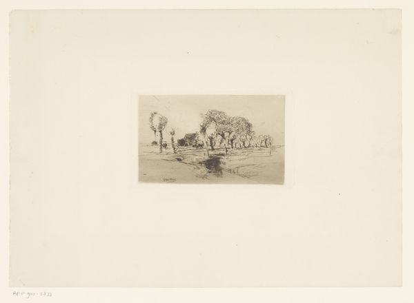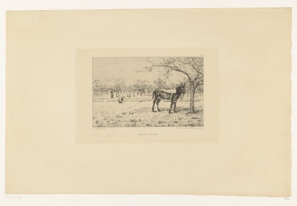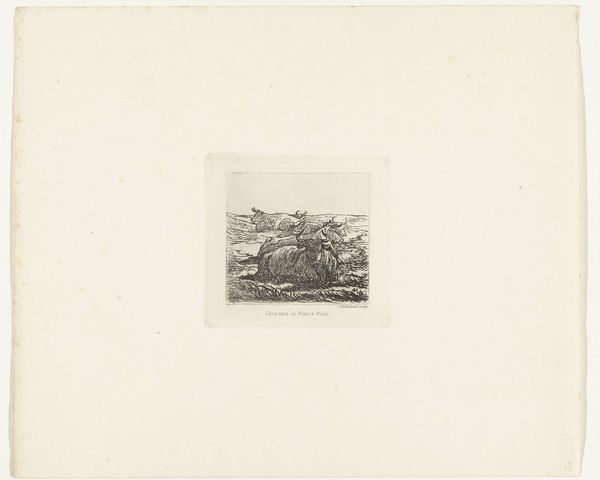 Curator: This is Armand Collard’s "Four Donkeys on the Beach," likely created between 1848 and 1909. It's an etching, a print, created with ink on paper. Editor: Well, it’s bleak, isn’t it? Those poor donkeys, they look so dejected. The whole scene feels… windswept and melancholic, somehow. Curator: The choice of realism places them starkly in their environment. Donkeys in art often reflect ideas of burden, labor, and the working class. And of course, the beach as a site carries its own social and historical baggage, particularly concerning labor and leisure. Editor: Burden, yes, that’s it! You can almost feel the weight they carry, emotional or physical, maybe both! I keep thinking, are they longing to be anywhere else? Is that tiny sailboat on the horizon mocking them? Curator: Their stillness juxtaposed against the potential for movement is key. It asks questions about their social positioning and limited agency. Also, note the almost equal emphasis on the landscape and the animals. This speaks to humanity’s intertwined relationship with the natural world and how we’ve historically extracted labor from it. Editor: Ah, so not just a charming pastoral scene, then? I can see that, especially the way the artist captured them in such simple lines. The light and shadow emphasize their weariness but still conveys a sense of dignity. It makes you wonder about the socioeconomic dynamics at play here! Who owned these donkeys? What was their purpose? Curator: Exactly! And this seemingly simple scene of labor carries complex layers about social hierarchies and even animal rights issues in how they interact within systems of exploitation. Editor: Food for thought for our day at the beach, huh? I will never look at donkeys quite the same way again. The subtle social commentary slipped in there is simply astonishing. Curator: Precisely. Hopefully, reflecting on this will empower new avenues for critical engagement with art history itself.