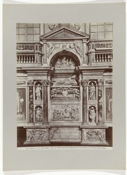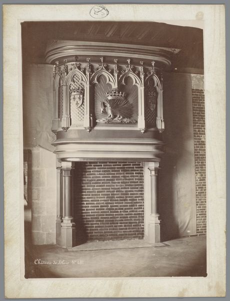 Editor: So, this photograph, “Gipsafgietsel van een schouw in het Musée des monuments français te Parijs” was taken by Médéric Mieusement, sometime between 1875 and 1900. It's a gelatin silver print of a plaster cast of a mantelpiece. What strikes me is how this image captures not just an object, but an ideal of historical and cultural permanence. What's your perspective on this work? Curator: This image speaks volumes about 19th-century France's relationship with its past, doesn't it? The Musée des Monuments Français was created precisely to preserve and display fragments of architecture and sculpture threatened by revolution and modernization. Photography then plays an important role. Mieusement's photograph, then, isn't simply a document of a mantelpiece. It is about power, class, and the construction of national identity through a selective engagement with history. What do you make of the architectural details and their potential symbolism? Editor: The neoclassical details, the symmetry... it all seems very deliberate, like an attempt to assert order and stability. I'm just wondering who got to decide which monuments were worth preserving and what that says about the values being imposed. Curator: Exactly! The museum and photographs like these presented a very specific, elite-driven narrative of French history. Who was represented in these "monuments," and more importantly, who was conspicuously absent? The selection, preservation, and photographic reproduction were acts of cultural and political affirmation. And for whom? To perpetuate specific cultural dominance by certain ruling classes, but also to educate rising working class regarding values to aspire to? Editor: That really reframes my understanding of what I'm looking at. It's not just an image of a mantelpiece; it's an active participant in a cultural and political dialogue. Thanks, that's really helpful. Curator: And it reminds us that even seemingly neutral acts of documentation can be powerful tools for shaping collective memory and power relations. We are constructing cultural history every time we collect images and artifacts. It's essential to constantly question those narratives.