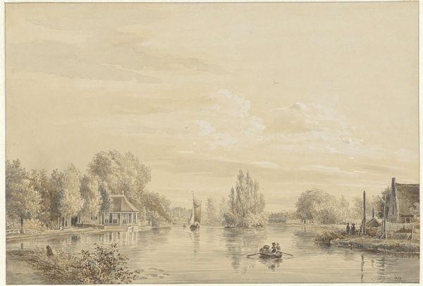 Curator: Marlow's "View on the Thames" presents a tranquil scene, emphasizing the river's role in daily life and commerce. Editor: It evokes such a sense of stillness, a quiet moment captured despite the implied activity. The Thames almost acts as a mirror, reflecting the sky and daily life. Curator: Marlow, born in 1740, painted this view to capture the river as a vital artery for trade and connection, showing the labor of people in contrast with nature. How do you interpret those swans? Editor: Swans often symbolize grace, beauty, and even love. Here, their presence feels almost like an intentional placement, highlighting both natural beauty and the class divisions present. They seem to float along unaffected by the world alongside them. Curator: I agree. Considering the era's social structures, their undisturbed peace can be viewed as a pointed counterpoint to the working-class figures. Editor: It adds a complex layer to what initially appears as a simple landscape. It is so interesting to consider the artist's view when making such works.