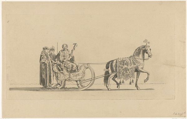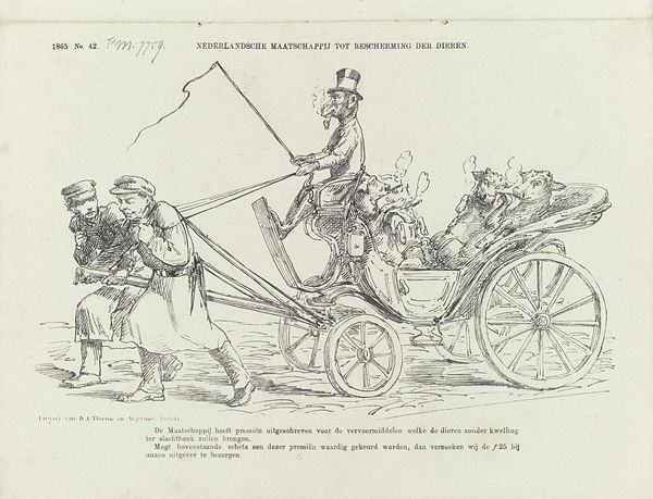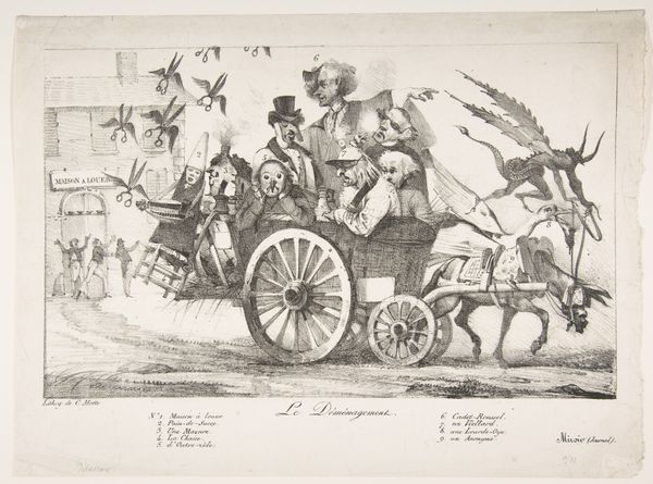 This lithograph was made in England by John Doyle, likely sometime in the 1830s or 40s. It depicts three men riding in a horse-drawn carriage. It’s titled “A New Way to Drive Over an Old Road; How Not, Always, Get Out of Order.” The men in the carriage are Lord John Russell, Henry Inglis, and Lord George Bentinck, all members of parliament. The image uses the visual code of caricature to poke fun at these figures. The metaphor of a carriage being driven in a new way over an old road likely refers to political reforms. Doyle’s work appeared during a time of great social change in England, with the rise of industrialization and the expansion of the British Empire. Political cartoons like this one offer insight into British social life during this transformative period. To understand more, historians consult parliamentary records and newspapers to understand the political context. We can then see how Doyle’s work contributed to public discourse and shaped popular opinion.