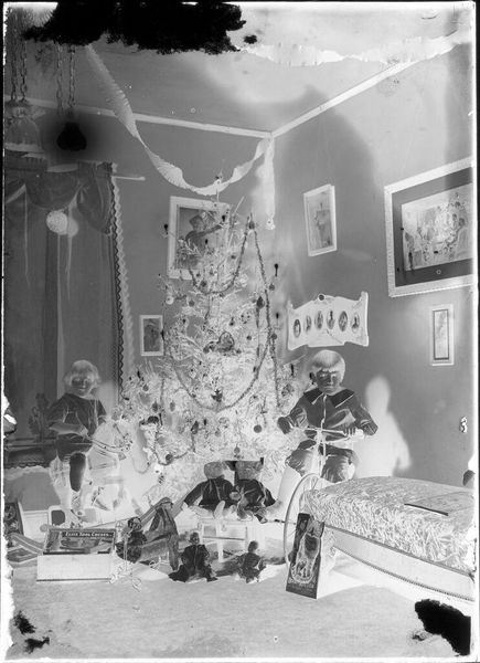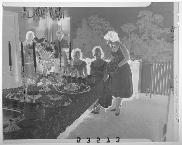Editor: This is an untitled photograph by Martin Schweig depicting two young women with their mother inside a fancy living room. They're holding bouquets of flowers, and there's a strong sense of formality. What do you see in this image? Curator: The formality you noted is striking. Bouquets were often used as symbolic gestures in portraiture, representing innocence, beauty, or even betrothal. Here, amplified by the elaborate interior, they speak to social aspirations. What memories do these symbols evoke for you? Editor: I'm not sure. It feels posed and a bit…distant. Curator: Indeed. The staging, the careful arrangement, all point to a desire to project a certain image, a cultural memory being constructed for posterity. Consider the fireplace. Is that a hearth of domesticity or a stage for display? Editor: I guess it's both. It's fascinating how much symbolism is packed into a simple family photograph. Curator: Exactly. It reminds us that even casual snapshots are steeped in cultural meaning, if we take the time to look.