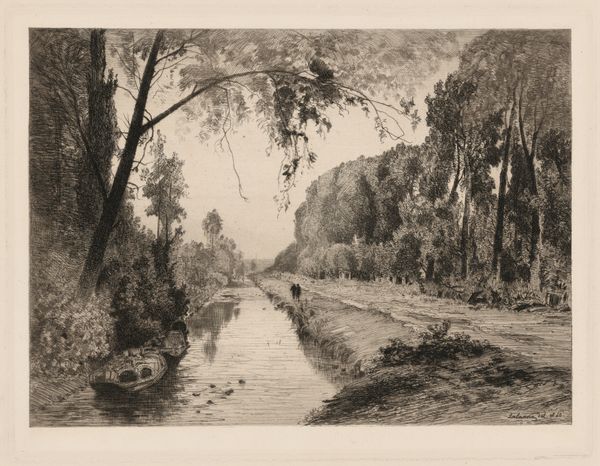 Curator: Looking at "Afwateringskanaal bij Loeboe Dalam op Sumatra" a photograph taken by Carl J. Kleingrothe sometime before 1898. This tranquil scene captures a drainage canal near Loeboe Dalam in Sumatra. It’s part of the Rijksmuseum collection, offering us a glimpse into a specific time and place. Editor: My immediate impression is of stillness. The muted tones contribute to a sense of quiet contemplation. The composition is very horizontal, creating a feeling of gentle, continuous flow. Curator: Indeed. Water, especially flowing water, carries profound symbolic weight in many cultures. Here, the drainage canal perhaps represents both life-giving sustenance and the managed control of nature—a subtle commentary on Dutch colonialism in the region. We see genre painting elements too. Editor: I find the formal arrangement quite compelling. The central canal bisects the landscape, dividing it into mirrored halves. The framing foliage directs our gaze, using depth and tonal variation. There's a clever use of light reflected on the water to lead the eye deeper into the image. Curator: That mirrored reflection definitely deepens the reading. Consider how this image might have functioned within the context of Dutch Orientalism. The artist presents an ‘exotic’ landscape—carefully composed, but likely concealing the more complex social realities of Sumatra at the time. Editor: Precisely, it’s curated, styled, and packaged for Western consumption. One could examine the contrast between the taming of the water through engineering and wildness and how that expresses power relations. Curator: Perhaps the relative lack of human presence reinforces the sense of colonial control and idealization. By focusing on the natural elements, the artist creates a serene, almost timeless view of this landscape. Editor: Ultimately, it functions as a fascinating study of lines, forms, and values within a deceptively straightforward composition. Curator: I agree; the confluence of symbols and colonial agendas invites us to contemplate history and landscape. Editor: It all becomes a little clearer through examining these stylistic features, wouldn’t you say?