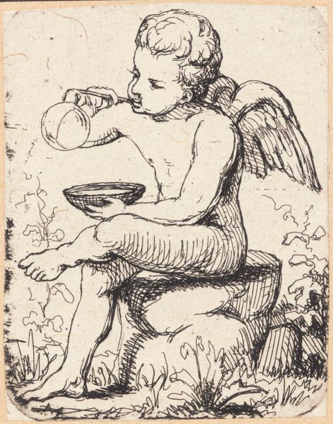 Curator: This is "Mellemtitel nr.1 til H.C. Andersen, 'Eventyr og Historier', Bind 1" created between 1870 and 1873 by H.P. Hansen, residing here at the SMK. It is a lovely, small engraving, intended as a frontispiece for Hans Christian Andersen’s fairy tales. Editor: It’s so delicate, almost ephemeral. The light touch of the engraving perfectly captures that fleeting moment of a bubble floating. Curator: Yes, and note how the medium of print—often associated with mass production and dissemination—is here used to create something quite intimate and personal. Consider the labor involved in creating such fine detail on a metal plate, each line carefully etched. The act of reproduction elevates, rather than diminishes, its artistry. Editor: It really does. There's a fragility in those lines that speaks volumes. The cherubic figure blowing bubbles is lovely—very classical, yet wistful. He seems to be creating these iridescent dreams that drift away, like Andersen's own stories released into the world. Curator: Precisely! The allegory is quite potent: the angel perhaps representing inspiration or the creative spirit, the bubbles as the transient nature of life or the fragility of dreams, and the birds flying above mirroring the soaring imagination. These were intended as chapter headings within bound volumes – consider the industrial act of bookbinding bringing the artist, author and audience together. Editor: It makes you wonder about the intended audience, too. Children encountering these images, then the fantastical tales...the bubbles could equally be tears. They hold so many possibilities and questions about existence itself. Curator: A wonderful point, speaking to the core of Romanticism, this notion of capturing sublime themes on what would have become accessible books. Editor: Yes. I appreciate how this one seemingly small engraving connects tangible realities with something boundless. That tension makes it very intriguing and moving. Curator: And that interplay encapsulates the beauty in appreciating works that merge production with imagination and fantasy. Editor: Absolutely, I'm taking with me today the enchanting, thought-provoking perspective between something physical that yields intangible wonder.