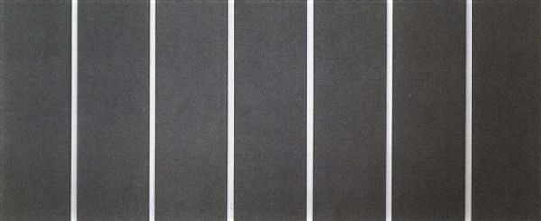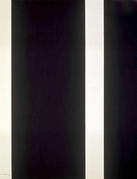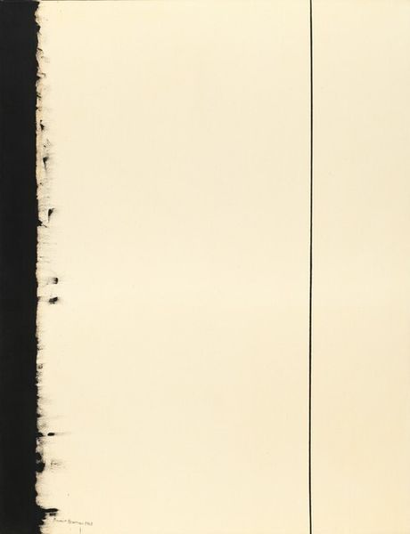 Editor: We are looking at Barnett Newman's "Thirteenth Station," painted between 1965 and 1966. It's striking in its simplicity—stark black fields divided by a vertical white line. The scale is quite imposing. How do you interpret this work, focusing on its visual language? Curator: Formally, we must observe the insistent verticality, the interplay between void and presence enacted by the black fields and the "zip," as Newman termed the white vertical line. Consider how the contrasting colors, black and white, operate. They don't just depict; they *structure* our experience of the painting. Do you notice the subtle variations in the black fields? Editor: Yes, now that you mention it, the black isn't uniform. There are slight shifts in tone, almost like looking at different densities. What’s the impact of these tonal shifts? Curator: Precisely. Those shifts introduce an element of dynamism, preventing the composition from becoming static. The "zip" isn’t simply a divider; it’s a formal element that activates the surrounding space, calling attention to the surface and materiality of the canvas. We can contemplate how it makes us reconsider figure-ground relationships in painting. Editor: That’s fascinating. It seems that what at first appeared simple is actually a complex interplay of form and color. It prompts one to really analyze line, tone and field. Curator: Exactly. The genius of Newman lies in his capacity to elicit profound contemplation through ostensibly minimal means. He reduces painting to its essence: pure form, color, and the sublime encounter of the viewer before the canvas.
