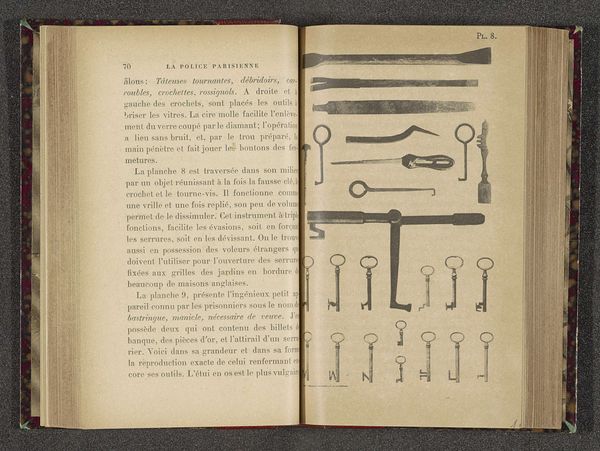 This anonymous print, titled "Bastringue," depicts a collection of tools used by thieves to conceal money within their bodies. The stark, symmetrical arrangement of these objects—keys, saws, and a cylindrical container—against the neutral background creates a sense of unsettling order. The choice to present these illicit tools in such a clinical, almost taxonomic fashion, underscores a fascination with the structural aspects of criminality itself. Each instrument, rendered with meticulous detail, becomes a signifier within a larger semiotic system of theft and concealment. The print destabilizes the conventional understanding of boundaries, both physical and moral. It invites us to consider the complex relationship between form, function, and the human body, and to confront the unsettling notion that tools of subversion can be as precisely crafted as tools of creation.