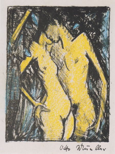 Curator: Looking at this piece, I immediately feel drawn into a private, almost secretive moment. The way the figures are positioned, turned away and absorbed, suggests a world apart. Editor: We're observing Otto Mueller's "Zwei Mädchen mit Handspiegel I", or "Two Girls with Hand Mirror I," created around 1919. It's a lithograph on toned paper, a medium that seems perfectly suited to the intimacy you described. What really intrigues me is how he achieved such expressive qualities with lithography, a printmaking process usually associated with reproducibility. Curator: Exactly! It’s this intimacy within the public sphere that holds tension. The nude figures were considered controversial, breaking social taboos, and at the same time, widely printed as lithographs. How do you think the printing process might reflect this tension between the artwork as art and product? Editor: Considering the period after the First World War, materials were scarce, and printmaking provided artists a space to explore innovative modes for generating artworks. Looking at the print itself, I see the paper's texture interacting with the ink in very deliberate ways, it appears the way he pulled each print varied from copy to copy, making them uniquely expressive rather than purely replicative. Curator: Yes, it is interesting to think of Mueller as deliberately breaking from more academic artistic practice. And look at their gestures, so focused. What do you see? Editor: Well, one figure seems absorbed in applying makeup, or simply admiring herself in a hand mirror, while the other watches on. There’s something almost ritualistic about it, but grounded in the everyday. How does that relate to what you consider to be the public role of art in society at this moment? Curator: In a time of societal upheaval, Mueller uses familiar, sensual themes. This combination creates an accessible yet intimate portrayal of womanhood. The choice of figures that almost blend into the background reflects a sense of alienation prevalent in German Expressionism. Perhaps this reflects society grappling with change by simultaneously embracing and concealing elements of tradition and modernity. Editor: I see what you mean. Mueller clearly chose materials and processes that underscored the tensions of his time. It’s far more complex than just an image of two women; it’s about the labor of creation and its cultural resonance. Curator: Indeed. And how fascinating it is to consider how artistic intent interacts with social consciousness. It helps one understand how museums provide us with space to connect with ourselves and also see how history is just repeating itself, and reflect.