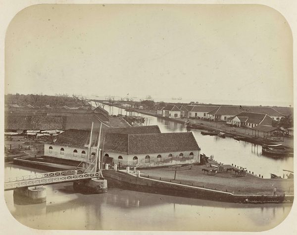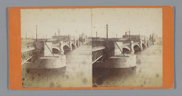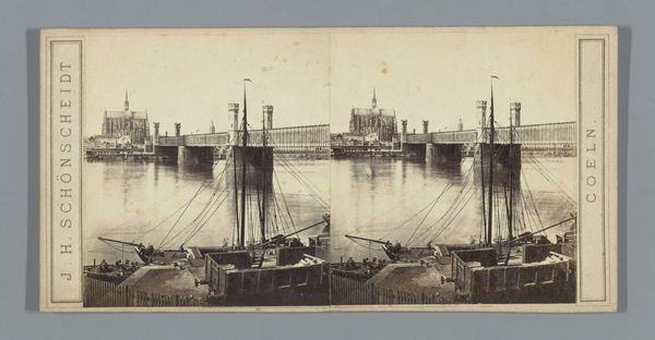 Johann Friedrich Stiehm captured this stereoscopic photograph of the Mosel Bridge in Koblenz, Germany, using a monochrome process. The photograph is structured around a strong horizontal axis defined by the bridge itself. The bridge is built in a series of arches that create a repetitive visual rhythm, drawing the eye across the frame. The lower part of the image contrasts sharply with the ordered structure of the bridge. Piles of raw materials and timber are scattered irregularly, introducing a sense of disarray that juxtaposes the bridge's symmetry. Stiehm destabilizes traditional landscape photography by not focusing solely on the picturesque view but also on elements of industry and construction. The photograph’s composition invites viewers to consider the relationship between human construction and the natural landscape. The ordered, constructed bridge, set against the disarray of materials, creates a dialogue about progress, order, and their impact on the environment. It is an early investigation into how our built environment intersects with and alters the natural world.