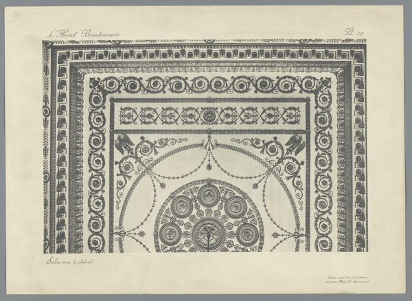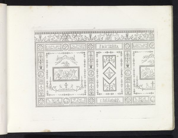 Editor: This work, "Twee ornementale panelen," or "Two Ornamental Panels," is an 1817 drawing by Pietro Ruga. It feels very architectural, like designs for ceiling decorations or perhaps tiled floors. The details are so precise! How might we interpret the symbolism used here? Curator: It's intriguing how these panels function almost as cultural palimpsests, isn’t it? Layered with symbols harkening back to classical antiquity. Notice the geometric shapes, they speak to the Neoclassical movement's fascination with order and reason. But consider too, how these patterns would resonate with viewers of the time. What existing visual language do you think they were fluent in? Editor: Well, given it's 1817, wouldn’t people still recognize some common Greek or Roman motifs? Like, weren't those still considered quite fashionable? Curator: Precisely. But think about it on a deeper level. Beyond mere fashion, what did those classical motifs *mean*? What aspirations, what sense of continuity were they meant to evoke in post-Napoleonic Europe? Were they reaching back for an age of stability and greatness? The images within tap into something deep. Editor: So, these aren't just pretty patterns. They're almost like… coded messages about power, history, and perhaps even a yearning for a different time? Curator: Exactly! It's like the artist is channeling a collective memory. Each carefully placed line, each flourish, resonates with the weight of centuries. Look, here's something I missed earlier -- is that perhaps the *caduceus* interwoven on the right side of the piece? This points to further layers of hidden meaning... can you see any further objects depicted here? Editor: I see stylized dolphins on the other design and a woman in what looks like classical garb. This emphasis makes it a time-capsule -- a window into how early 19th century artists and designers were re-imagining older histories to establish meaning within their work! Curator: Precisely! Each panel seems to echo this notion, but the two combined show different stylistic and historic interpretations of an old visual language.