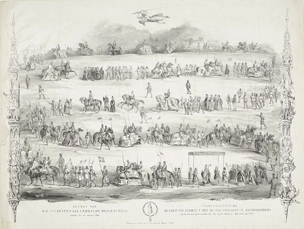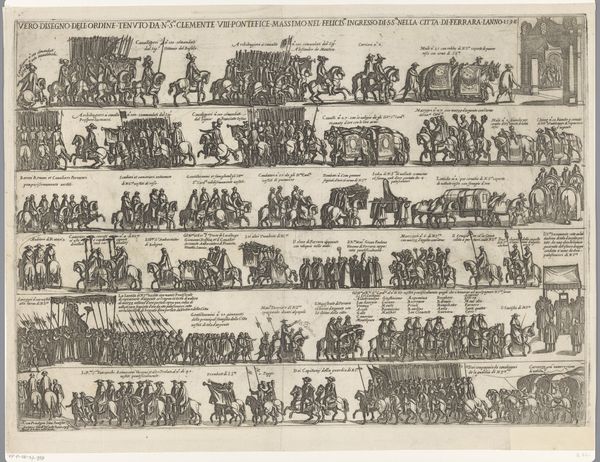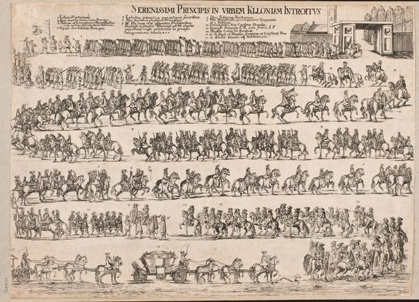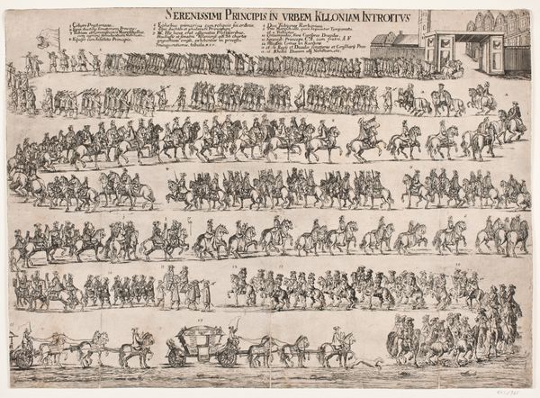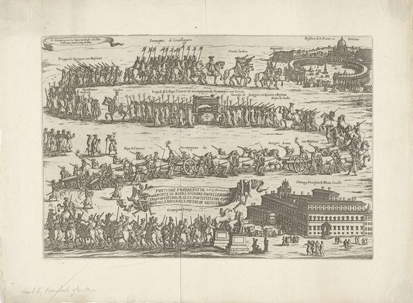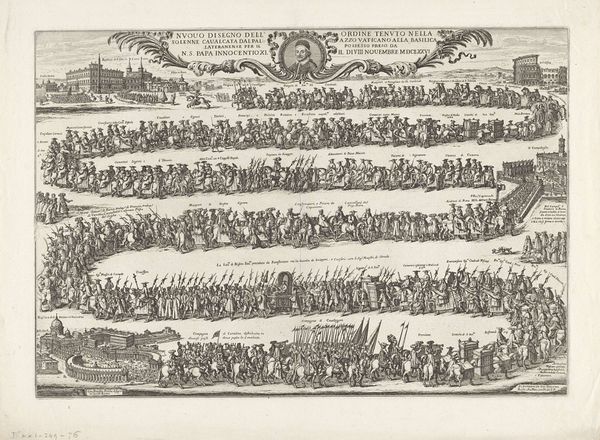 Editor: Here we have an engraving from 1655, an anonymous piece titled "Intocht in Rome van koningin Christina van Zweden," or "The Entry into Rome of Queen Christina of Sweden." It's teeming with figures and feels quite… regimented, almost like a parade captured in a diagram. What strikes you most when you look at it? Curator: You know, diagrams are interesting. I get this overwhelming sense of pageantry meticulously chronicled – almost surgically dissected and put back together for posterity, right? Look how the lines carve out not just shapes, but also hierarchies, flows, a social map really, laid out on this… well, gorgeous flattened plane. Makes me wonder: is this less about Christina's arrival, and more about solidifying her position within the Roman… tapestry, would you say? Editor: That’s a great point. It's like a seating chart at a wedding, but for power. I hadn't considered that the artist might be less interested in the event itself and more in the political message it conveys. It reminds me of Byzantine icons, stiff and symbolic, not quite "realistic" or baroque. Curator: Precisely. It transcends mere documentation. Notice the architecture, cleverly deployed as both backdrop and character? St. Peter’s isn’t just “there”; it's an active participant, nodding approvingly, don't you think? That little dome… What I mean is: look at it! How cheeky that is! It's pure architectural theater. And you know theatre when you see it. How do the lines and lack of color make you feel about Christina's journey? Editor: They certainly amplify the theatrical elements while distancing us from her personal experience. The focus isn't really on her emotions or feelings, is it? More like the significance of the political moment. So what new layers have been added to this, for you? Curator: You know, seeing it through your eyes, through fresh undergraduate eyes, has underscored this sense of orchestrated power. This wasn’t just an entry; it was a statement. And, I daresay, quite the mic drop. Thanks to the sharp diagrammatic approach it somehow makes a statement, no? A silent pronouncement to an ever expanding audience!