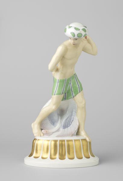 Curator: Well, if that isn’t precious! The composition almost vibrates with its own importance. Editor: You know, it's hard not to be charmed. What we’re looking at is a porcelain sculpture called “Atlas of the World,” made by the Meissen Porcelain Manufactory sometime between the 18th and 19th centuries. Here at the Art Institute of Chicago, it sits among other decorative arts. It’s… well, it's something. Curator: Something alright. Is it just me, or is that globe rather whimsically colored in an odd pastel green with little doodles scattered around it? The expression on Atlas's face is far too serene given what he is supposed to be doing for eternity! And all perched on a frothy cloud? Oh my! It looks like a baroque-gone-bonsai dream. Editor: The green of the globe—not traditionally terrestrial—definitely introduces an allegorical element; it becomes more conceptual than geographical, right? This, combined with the material – porcelain—speaks to the aristocratic circles that the manufactory served. It becomes a show of worldly dominion for one's personal viewing pleasure! But the draftsmanship in those hand-painted constellations! Stunning! Curator: It's deliciously over-the-top. Knowing it’s porcelain makes it even more delicate. The entire thing feels almost like a commentary on the burdens of power, rendered in something so fragile and exquisite. I bet it sparkled under candlelight, nestled amongst precious objets. I’d wager someone had quite the cabinet of curiosities. Editor: Definitely a curiosity cabinet piece, echoing themes of humanism and the Enlightenment through a Baroque sensibility of dramatic expression with a highly refined surface. The curve of his back is, well, literally the crux of it, no? Curator: And isn't that the point? It’s the ultimate burden, this impossible weight! Yet he carries it with... flair! In all, an extravagant rendering, perhaps capturing that peculiar space between what we are supposed to bear versus what we adorn ourselves with in the bearing of it all. Editor: Ultimately, a demonstration of value, both in terms of labor and symbolic meaning, frozen in this enduring little mythological tableau.
