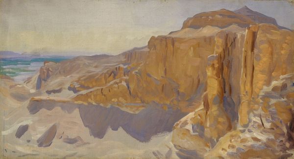 Editor: Here we have Gustave Caillebotte's "Cliff at Villers sur Me," an oil painting from 1880. The stark contrast of light and shadow makes it feel dramatic and a little intimidating. What catches your eye about this piece? Curator: The cliff face is rendered almost as a geological icon. Notice how the layers are delineated. Do you think they might represent a cultural memory embedded in the land itself? It’s a fascinating dialogue between the natural world and the human perception of time, don't you think? Editor: That's an interesting point. I hadn't considered it as a symbolic landscape. So, you're seeing the cliff as more than just a natural formation? Curator: Precisely! Consider how Caillebotte emphasizes the stratified layers. Layers, you see, not only represent geological time but perhaps also allude to the accumulating strata of history and experience. There's a psychological weight here, wouldn't you agree, in the way the cliff looms, almost guarding secrets? Editor: Yes, I do agree! I initially focused on the visual elements but missed the potential for deeper meaning embedded in the image. Thanks to your guidance, I see how Caillebotte’s cliff face embodies both natural power and symbolic resonance. Curator: And for me, thinking through the geological record as cultural memory has added a rich layer of interpretation!