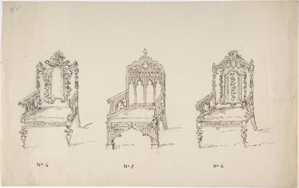 This anonymous sheet presents a design for four seventeenth-century style chairs, rendered in pen and ink. The visual experience is dominated by intricate, symmetrical forms that play with Baroque opulence, evoking a sense of historical grandeur. Each chair, numbered one to four, showcases a unique ornamental composition. The artist employs a semiotic system of elaborate motifs—scrolls, floral patterns, and geometric shapes—to communicate status and luxury. These elements aren’t merely decorative; they function as cultural codes, reflecting the values and tastes of the seventeenth century. By varying the design of each chair, the artist destabilizes any fixed notion of style, suggesting a playfulness within the established norms. Note the elaborate details in the chair backs and legs. The artist uses line to create texture and depth, almost as if inviting a tactile exploration of these imagined objects. Ultimately, this design transcends its functional purpose, serving as a meditation on form and a cultural statement.