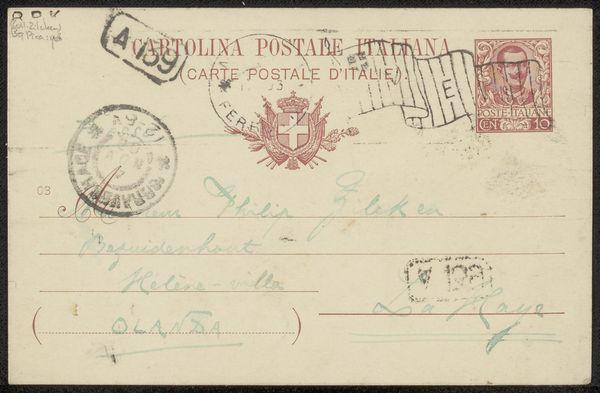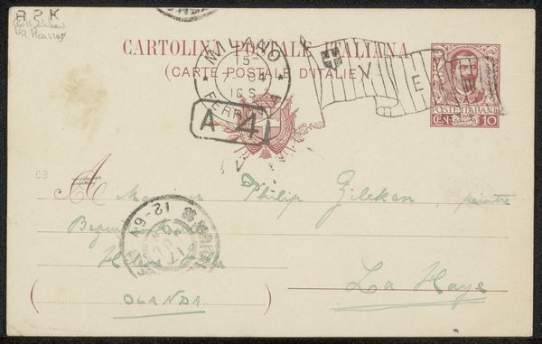 Editor: Here we have "Briefkaart aan Philip Zilcken," possibly from 1903, a print with ink. It's just a simple postcard, yet the postal markings feel so heavy and layered. What catches your eye in this unassuming piece? Curator: As a materialist, I’m immediately drawn to the object itself – the postcard as a readily available, mass-produced form of communication. Look closely at the ink. Note the wear and tear of its journey – the postmarks not only convey information, but also signify the physical movement of the object through different hands and places. Editor: That's interesting! So, it's not just about the message it carries, but the whole life of the postcard as an object? Curator: Precisely! The “Très Presse” marking is particularly fascinating. It speaks to the urgent need for communication, a sense of speed and efficiency driven by the demands of a burgeoning capitalist society. Consider the labour involved: the paper production, the printing, the postal workers, each playing a part in this small exchange. Editor: The postmarks, you're right, they're not just decoration; they're evidence of labour, like fossilized time. Curator: Absolutely. And let's not forget the recipient, Philip Zilcken, also an artist, implying an exchange within a specific art world ecosystem. We must consider the networks of production, exchange, and consumption that underpin even this seemingly simple object. Where do you see Zilcken and Pica fitting in society and influencing it via the materials they were exposed to and worked with? Editor: I never thought a humble postcard could tell such a complex story about industry, labour, and even artistic exchange. Thanks for opening my eyes to its materiality! Curator: Indeed! By examining the process, materials, and social context, even the most mundane object can reveal a wealth of information about its time.