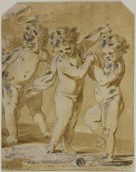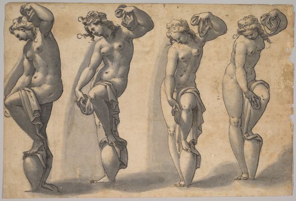 Curator: Let’s turn our attention to Gaspare Diziani’s "Mars, Venezia und Neptun (Scheinskulptur)" a drawing here at the Städel Museum rendered in ink, gouache and pencil. What are your initial thoughts? Editor: There’s an immediate coolness to the palette—the limited range of grey tones gives the work a restrained and classical mood, as if we are observing faint sculptures or figures under a subdued light. Curator: Yes, and this muted palette seems perfectly aligned with its probable function as a preparatory study. Diziani was operating within a 18th-century Venice that saw its fortunes entwined with complex political and mercantile dynamics, mirrored by Venice's own self-image as a potent, quasi-mythical force in that reality. Consider the allegorical representation of Venice, positioned centrally: her proximity to Mars and Neptune perhaps suggests Venice's power brokering between land and sea. Editor: The composition itself contributes significantly to that effect. The placement of Venezia between Mars and Neptune creates a visual equilibrium, reinforcing that symbolic positioning you're speaking of. The texture of the paper is palpable here too, almost grounding these imagined figures into something that could be touched and studied materially. Curator: It's key to note that allegory within this time provided fertile ground for exploring identity and power, often framing gendered representations in specific ways. Notice how Venezia embodies sovereignty—crowned and poised over the lion—compared to the masculine energies represented by the war-ready Mars and the elemental Neptune. How do such symbolic hierarchies intersect with Venice's historical realities, where civic authority, trade, and myth coalesced? Editor: The semiotic weight of those attributes - the lion, Neptune's trident, Mars' spear, the armour - anchors their meaning. Without them, we lose crucial context. But focusing solely on symbolic meaning sometimes obscures the formal elegance of the piece. The way Diziani uses shadow, for instance, or the controlled spontaneity of his lines…these aspects provide so much to the drama and beauty of the figures. Curator: Perhaps, but isolating form from socio-political meaning risks muting the artist's cultural engagement. Understanding these representations alongside Venice's complex identity, trade and diplomatic position contextualizes our understanding, doesn't it? Editor: Point taken. Appreciating that tension does indeed bring us to a richer understanding of both the object, and the complex cultural landscape in which it emerged.