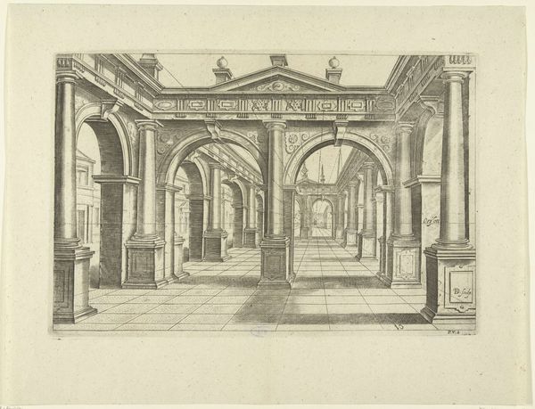Curator: Looking at Julius Milheuser's 1635 print, "Kerkinterieur," what's your initial reaction to this rendering of a church interior? Editor: It’s immediately striking, isn't it? The starkness, the near clinical detail rendered through engraving. I'm curious about the availability and preparation of materials during that period. The sheer labor to achieve this! Curator: Precisely! Think about the socio-political context, the church's power and influence in 17th century society, particularly over artists who depended on their patronage. Did their faith genuinely inspire them or were these commissions driven more by market demands? Editor: An important question. Given the level of detail, from the textured stone to the carefully rendered figures, there was an intense awareness of the materials. The different tones, and shadows – a complete control of production! And how does the perspective play into perceptions of religious institutions? Curator: The dramatic use of perspective emphasizes the church's grandeur, certainly. But it also draws the eye upward, reinforcing established religious hierarchies. There's something to be said about the interplay of sacred space and control here. Editor: Absolutely. This piece gives us such insight into baroque architecture, revealing an efficient machine made of organized labor, where printmaking serves the institution, replicating images across communities that expand through the markets that the artist helped produce. The very texture seems like a tangible assertion of church dominance, of the time taken for even such simple image distribution! Curator: What truly interests me are the anonymous figures within the interior— the praying man, the observer… Are these mere adornments to emphasize scale and piety, or were they carefully planned inclusions to project certain ideals within baroque cultural politics? How are individual beliefs shaped or challenged by the institution? Editor: Right, because print was already impacting culture deeply at the time. Thinking about this, though, the level of planning required indicates something deeply intentional about its mass appeal... a sort of brand identity. The labor investment in creating an aura. Curator: Well said! By examining the artist, date and materials, as well as looking at the political and societal impact, it enhances my own analysis. Editor: The exercise also demonstrates just how profoundly art creation depended on materiality and markets as essential tools to broadcast identity.