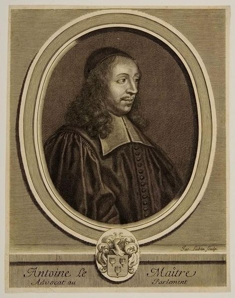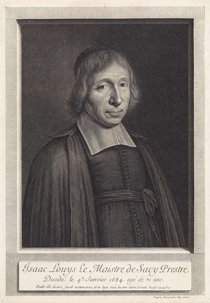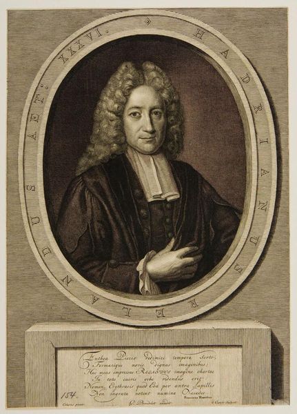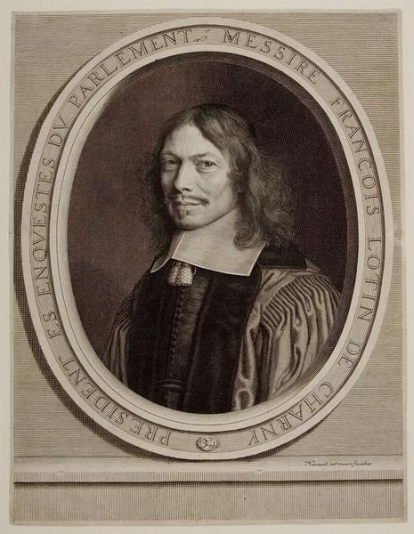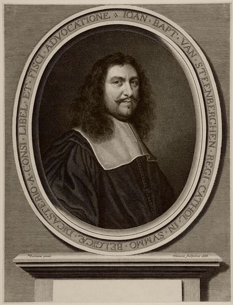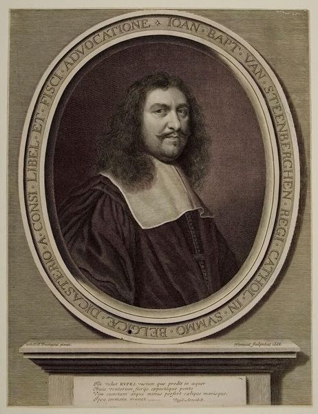 Curator: This is Cornelis van Dalen the Younger's portrait of Giovanni Boccaccio. The young artist, who lived from 1638 to 1664, captured the likeness of the famed Italian author. Editor: Something about the subtle lighting and the weight of that fur stole give the portrait a wonderfully melancholic feel. Curator: Melancholy is a good word. Books, especially those bound with cords, often stand for wisdom, but sometimes for the burden of knowledge. The subject's expression certainly carries the weight of both. Editor: Yes, the book becomes almost a memento mori. And Boccaccio's gaze, directed just past the viewer, pulls us into his pensive world. Curator: I agree. The imagery almost invites us to contemplate not just Boccaccio, but the passage of time and its effect on memory and legacy. Editor: I’ll walk away pondering just that, feeling a little wiser, and a little more aware of time’s fleeting nature.