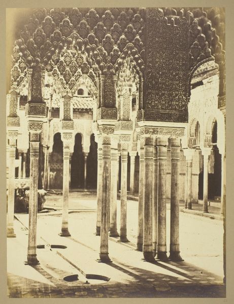 F. Linares made this photograph of the Court of the Lions in the Alhambra, using a process that was cutting-edge at the time. Photography was a relatively new medium then, sharply distinct from traditional artistic practices like painting or sculpture. Its dependence on chemistry and mechanics signaled a shift towards industrial modes of production. Linares skillfully captures the intricate details of the Alhambra's architecture. The play of light and shadow across the columns and carved surfaces emphasizes the texture and form of the original materials - stone, plaster, and wood. The photograph itself is a product of labor, from the mining of the chemicals used in the developing process to the skilled work of the photographer in composing and printing the image. It embodies a shift in artistic production, one that challenges our conventional understanding of fine art and craftsmanship, emphasizing the importance of technology, labor, and context in understanding visual culture.