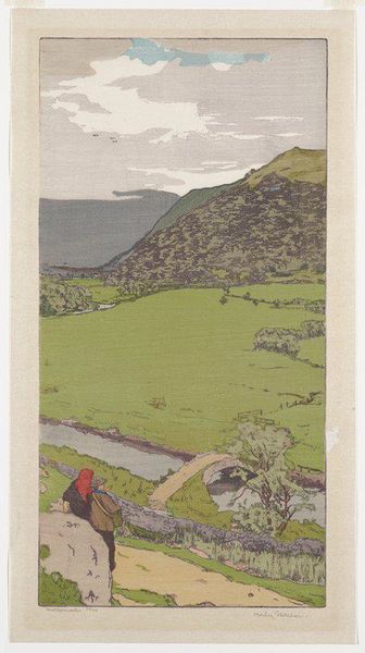 Elizabeth Colwell was known for her hand-lettering, a skill that put her in the Arts and Crafts movement, which emphasized direct interaction with materials, the uplifting role of design in everyday life, and the importance of hand wrought objects. Colwell’s interest in handwork also led her to woodcuts. Her teacher was B.J.O. Nordfeldt, a fellow Chicagoan who had recently discovered Japanese woodblock printing. For Seaside Landscape, Colwell not only cut, inked, and printed each woodblock (generally one for each color) in the Japanese manner, but she also followed Japanese design principles. The simplified shapes and flat color on the hills are classic features of Japanese prints, as are the aerial viewpoint and the pattern of crossed lines on the farmland. The sunny patch was achieved by painting different shades of watercolor directly onto the woodblock. About the time she stopped making woodcuts, in 1916, a major Chicago foundry cut a typeface she invented, called Colwell Hand-Letter.