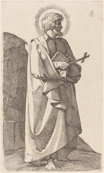 Curator: This drawing, created between 1457 and 1473, comes from the Middle Rhine region of Germany. It's titled "Standing Scholar (Prophet?) Turned to the Right (Recto); Standing Scholar (Prophet?) Turned to the Left (Verso)." Editor: The first thing I notice is the vulnerability communicated through the raw graphite lines. The scholar's garb seems weighty, almost burdening him, and contrasts sharply with the bare feet which somehow accentuate a humility. Curator: That's interesting, because I read his elaborate costume differently. The folds and layers speak to the ways status and knowledge were visualized in the late medieval period. The gesture of the open hand is also interesting as a kind of signifier about public performance, while also holding what seems like a book. How is authority claimed and expressed? I can't help but read gender into this portrait as well. What performative function did dress and bearing play for medieval men? Editor: You make me consider how the symbols may point beyond a mere claim to authority, perhaps even to a spiritual obligation. The exposed feet bring forth questions of piety, the weight of learning offset against the physical burden of his uncovered humanity. Curator: His stance and expression further emphasize an introspective contemplation, almost burdened by prophecy. I want to know how it played out during this moment in history. Who exactly would this figure have been and how did those identity markers intersect? How does that interplay define him, what would it mean in society then, and in modern understanding? Editor: There’s something incredibly compelling about his gaze; a learned yet accessible and burdened man who presents, holds, and offers his own teachings. Curator: The artist certainly captured something resonant here about intellect, humility, power, and responsibility during the early formation of humanist philosophy in Europe. Editor: This close observation of detail suggests that we are seeing a vital turning point in art's treatment of humanity, which resonates into today. Thank you.