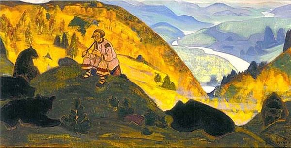 Curator: Let’s discuss Nicholas Roerich’s "Daughter of a Viking," painted in 1918 using oil paint. Editor: What strikes me is how the figure almost blends with the landscape. She seems connected to it, but I wonder how? What do you see in this piece from your perspective? Curator: I see a carefully constructed landscape built to evoke specific emotional and ideological responses. Notice how the application of the oil paint creates texture in the foreground hill but flattens in the ethereal, almost theatrical backdrop. Consider the economic factors driving artistic materials during wartime and Roerich’s choice to manipulate paint quality so drastically. It is the hand, and by extension, labor and social structures are encoded in this piece. Editor: That's interesting. So, you're saying the way he uses the material speaks to broader social circumstances, instead of artistic choices? Curator: Precisely! It is the interplay between intention, available materials, and artistic labour. Even her attire --it’s carefully crafted using specific techniques, signifying a certain class or role within her society. It's about labor, production, and consumption all embedded within the image itself. Roerich may have had an ideal in mind, but the limitations and the processes were important for how he realized the piece. Editor: So, beyond just seeing a figure in a landscape, you’re pointing out the story of how it was made and the world that shaped its making? Curator: Exactly. By understanding the process and materiality, we gain deeper insight into both the artwork and the cultural context it comes from. What did you gather from this artwork, Editor? Editor: Thanks! I learned to appreciate art through its connection with labor and materials, it reveals new ways of appreciation.